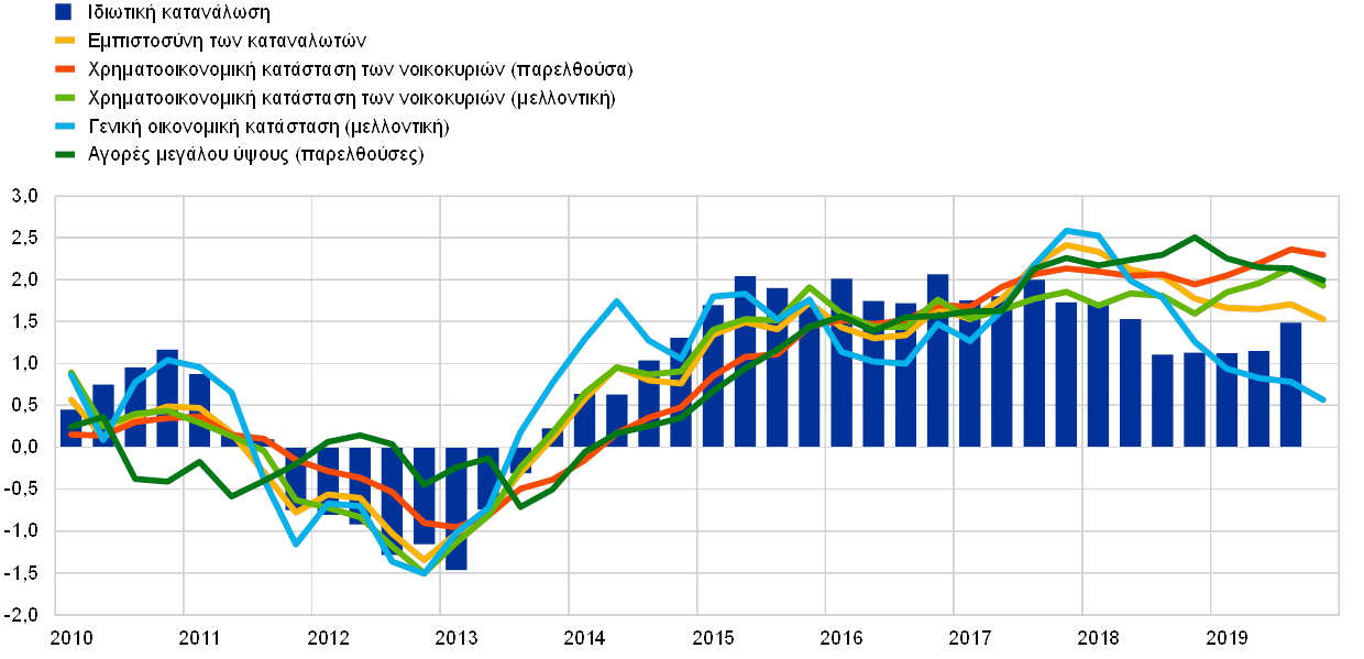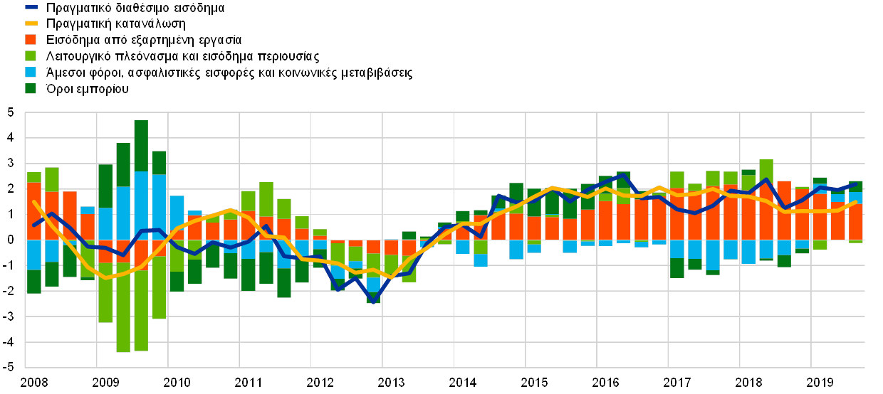 Η αύξηση της ιδιωτικής κατανάλωσης το 2019 στηρίχθηκε στη συνεχιζόμενη αύξηση του πραγματικού διαθέσιμου εισοδήματος, το οποίο με τη σειρά του ενισχύθηκε από την ανθεκτική αγορά εργασίας. Το εισόδημα εξαρτημένης εργασίας επηρεάστηκε θετικά τόσο από τις συνεχιζόμενες μισθολογικές αυξήσεις όσο και από την αύξηση της απασχόλησης, η οποία συνεχίστηκε, έστω και με φθίνοντα ρυθμό. Επιπλέον, οι άμεσοι φόροι, οι ασφαλιστικές εισφορές και οι κοινωνικές μεταβιβάσεις συνολικά πιθανόν να άσκησαν μικρή θετική επίδραση στον ρυθμό αύξησης των εισοδημάτων, σε αντίθεση με το 2018, κατά το οποίο η επίδρασή τους παρέμενε αρνητική (βλ. Διάγραμμα B). Ωστόσο, η συμβολή του λειτουργικού πλεονάσματος και του εισοδήματος περιουσίας, που τείνουν να συνδέονται στενά με την οικονομική δραστηριότητα, έγινε ελαφρώς αρνητική το 2019, ενώ ήταν θετική από το 2015 έως το 2018.