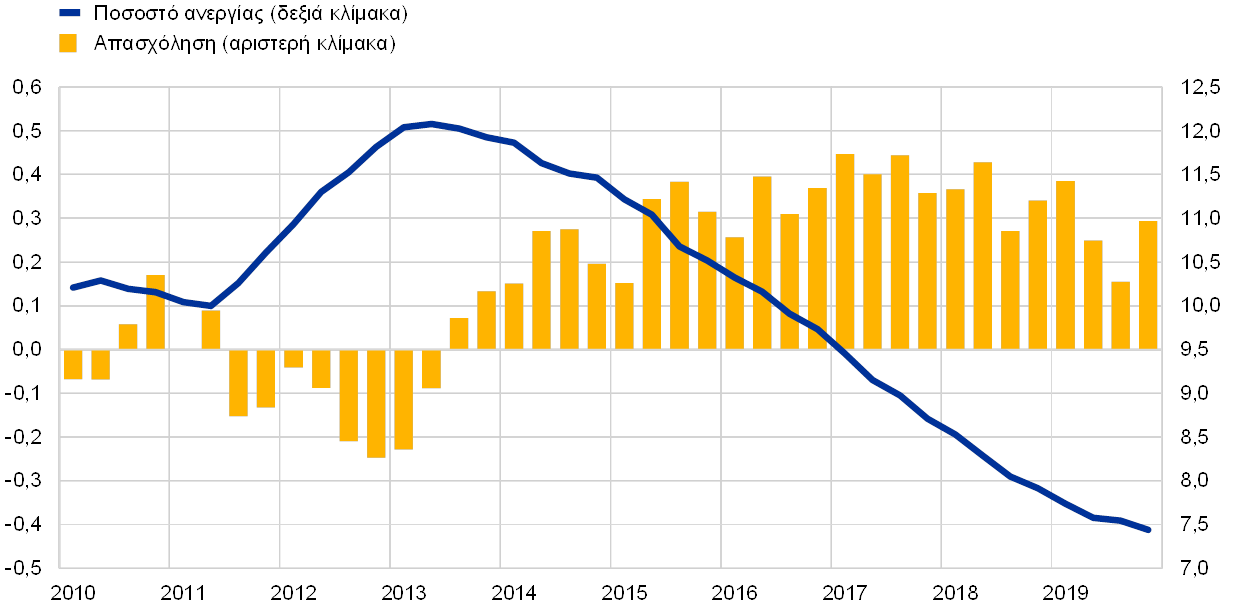 - Περισσότερες λεπτομέρειες όσον αφορά τη σχέση μεταξύ απασχόλησης και παραγωγικότητας στη διάρκεια της τρέχουσας επέκτασης της απασχόλησης βλ. στο πλαίσιο “Αύξηση της απασχόλησης και ΑΕΠ στη ζώνη του ευρώ”, Οικονομικό Δελτίο, Τεύχος 2, ΕΚΤ, 2019, καθώς και στο πλαίσιο “Σύγκριση της τρέχουσας επέκτασης της απασχόλησης στη ζώνη του ευρώ με τις ιστορικές εξελίξεις”, Οικονομικό Δελτίο, Τεύχος 6, ΕΚΤ, 2019.