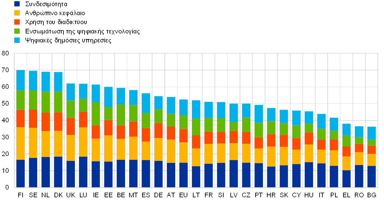 Σύμφωνα με τη βιβλιογραφία, ο ψηφιακός μετασχηματισμός έχει αντίκτυπο σε μια σειρά από σημαντικές οικονομικές μεταβλητές που ενδιαφέρουν τη νομισματική πολιτική. Τα εμπειρικά στοιχεία σχετικά με τις επιδράσεις του ψηφιακού μετασχηματισμού υποδηλώνουν ότι πιθανόν ωθεί ανοδικά την οικονομική δραστηριότητα και την παραγωγικότητα, ενώ η συνολική επίδρασή του στον πληθωρισμό δεν είναι ακόμη σαφής.[9] Το 2019 ο βαθμός ψηφιακού μετασχηματισμού των οικονομιών της ΕΕ κυμάνθηκε από περίπου 40 για τη λιγότερο ψηφιακή οικονομία έως περίπου 70 για την περισσότερο ψηφιακή, σύμφωνα με τον Δείκτη Ψηφιακής Οικονομίας και Κοινωνίας (DESI) της Ευρωπαϊκής Επιτροπής (βλ. Διάγραμμα 8). Ενώ οι οικονομίες της ΕΕ είχαν εν πολλοίς παρόμοιες βαθμολογίες ως προς τη συνδεσιμότητα, παρουσίασαν μεγαλύτερες διαφοροποιήσεις ως προς το ανθρώπινο κεφάλαιο, τη χρήση του διαδικτύου, την ενσωμάτωση της ψηφιακής τεχνολογίας και τις ψηφιακές δημόσιες υπηρεσίες.