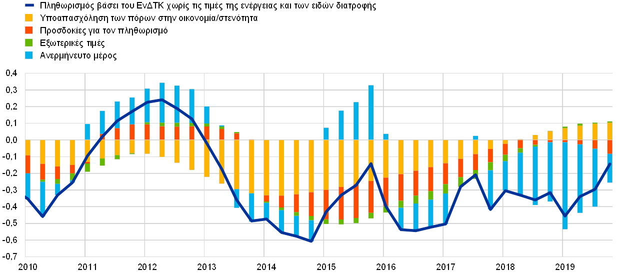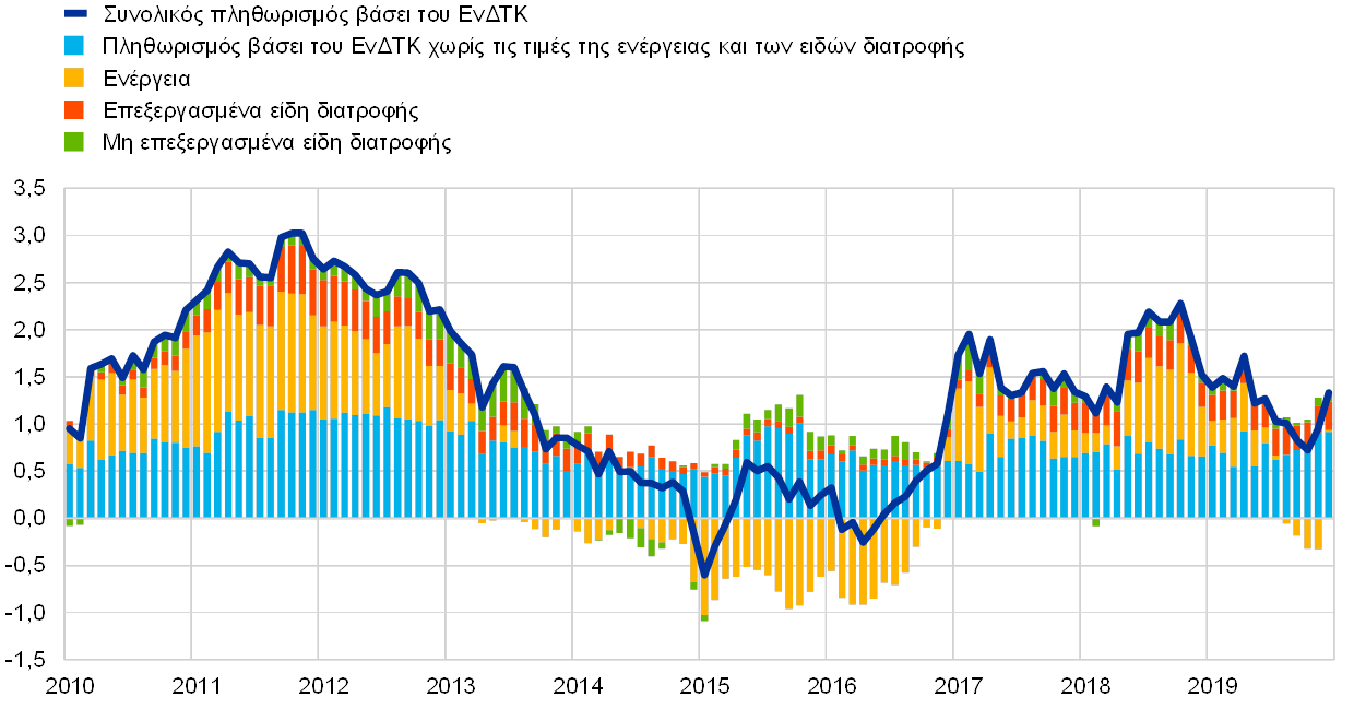 Ο μετρούμενος πληθωρισμός στη ζώνη του ευρώ διαμορφώθηκε σε 1,2% κατά μέσο όρο το 2019, έναντι 1,8% το 2018. Αυτή η μείωση αντανακλούσε τη μικρότερη συμβολή των δύο πιο ευμετάβλητων συνιστωσών, των τιμών της ενέργειας και των ειδών διατροφής. Χωρίς αυτές τις δύο συνιστώσες, ο πληθωρισμός διαμορφώθηκε κατά μέσο όρο σε 1,0% το 2019, όσο και τα δύο προηγούμενα έτη.
