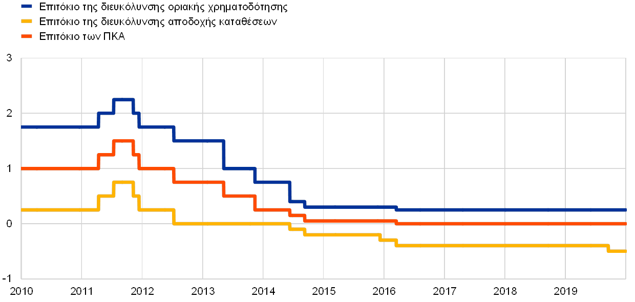 - Στις 12.9.2019 το Διοικητικό Συμβούλιο αποφάσισε να επεκτείνει τη δυνατότητα αγοράς τίτλων με αποδόσεις χαμηλότερες από το επιτόκιο της διευκόλυνσης αποδοχής καταθέσεων, στο μέτρο του αναγκαίου, σε όλα τα επιμέρους προγράμματα του APP. Για περισσότερες λεπτομέρειες, βλ. “ECB provides additional details on purchases of assets with yields below the deposit facility rate”, δελτίο τύπου, ΕΚΤ, 12.9.2019.