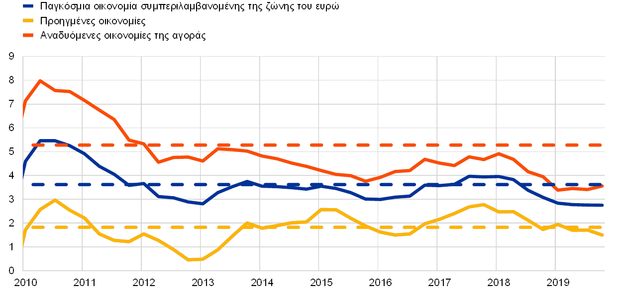Στη διάρκεια του 2019 ο ρυθμός ανάπτυξης της παγκόσμιας οικονομίας υποχώρησε έντονα. Μετά την κορύφωση που σημειώθηκε στα μέσα του 2018, η παγκόσμια οικονομία επιβραδύνθηκε σημαντικά και μεγεθύνθηκε με ρυθμό ο οποίος υπολειπόταν αισθητά του ιστορικού μέσου όρου και ήταν ο χαμηλότερος που έχει καταγραφεί από την παγκόσμια χρηματοπιστωτική κρίση (βλ. Διάγραμμα 1). Αυτή η παγκόσμια επιβράδυνση ήταν γενικευμένη και συγχρονισμένη μεταξύ των χωρών. Στις μεγάλες προηγμένες οικονομίες όπως οι ΗΠΑ, το Ηνωμένο Βασίλειο και η Ιαπωνία η εξέλιξη αυτή αντανακλούσε επιβράδυνση των ρυθμών ανάπτυξης από τα προηγούμενα επίπεδά τους που υπερέβαιναν τον μέσο όρο. Στην Κίνα η ανάπτυξη επιβραδύνθηκε και κατέγραψε ρυθμό που ήταν ο χαμηλότερος από το 1990 και γύρω στον σήμερα εκτιμώμενο δυνητικό ρυθμό. Στις άλλες μεγάλες αναδυόμενες οικονομίες της αγοράς, η ανάπτυξη ήταν γενικά αναιμική, αντανακλώντας εν μέρει τη βραδεία ανάκαμψή τους από πρόσφατες υφέσεις.