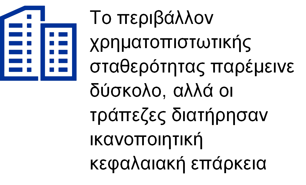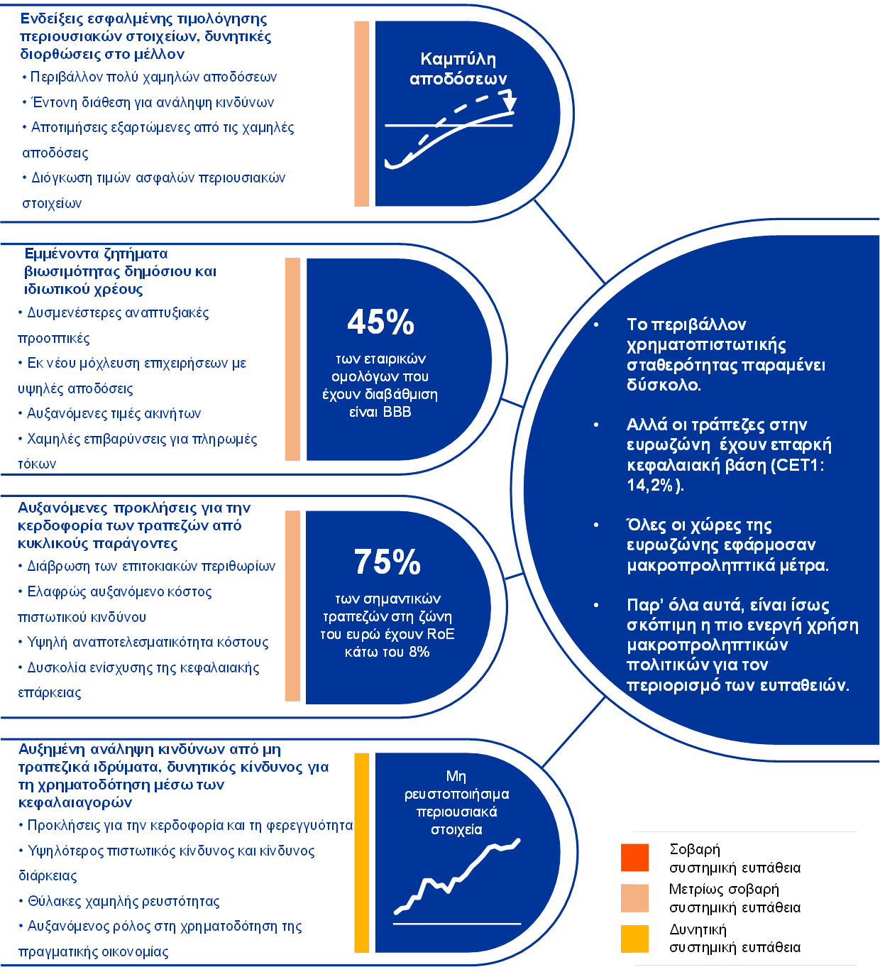 Η διαρθρωτικά χαμηλή κερδοφορία εξακολουθεί να αποτελεί πρόκληση για τις τράπεζες της ζώνης του ευρώ, μολονότι ο τομέας έχει ικανοποιητική κεφαλαιακή επάρκεια, με δείκτη κεφαλαίου κοινών μετοχών της κατηγορίας 1 (CET1) 14,2%. Στη διάρκεια του 2019 η έντονη τάση ανάληψης κινδύνων στις χρηματοπιστωτικές αγορές και στις αγορές ακινήτων συνέχισε να τροφοδοτεί τη συσσώρευση ευπαθειών στις τιμές των περιουσιακών στοιχείων, ενώ παράλληλα συνέχισαν να αυξάνονται και οι κίνδυνοι στον αναπτυσσόμενο μη τραπεζικό χρηματοπιστωτικό τομέα. Οι χώρες της ζώνης του ευρώ, κατόπιν διαβούλευσης με την ΕΚΤ, έλαβαν σειρά μακροπροληπτικών μέτρων με στόχο να περιορίσουν τους συστημικούς κινδύνους και να ενισχύσουν την ανθεκτικότητα σε αυτούς.