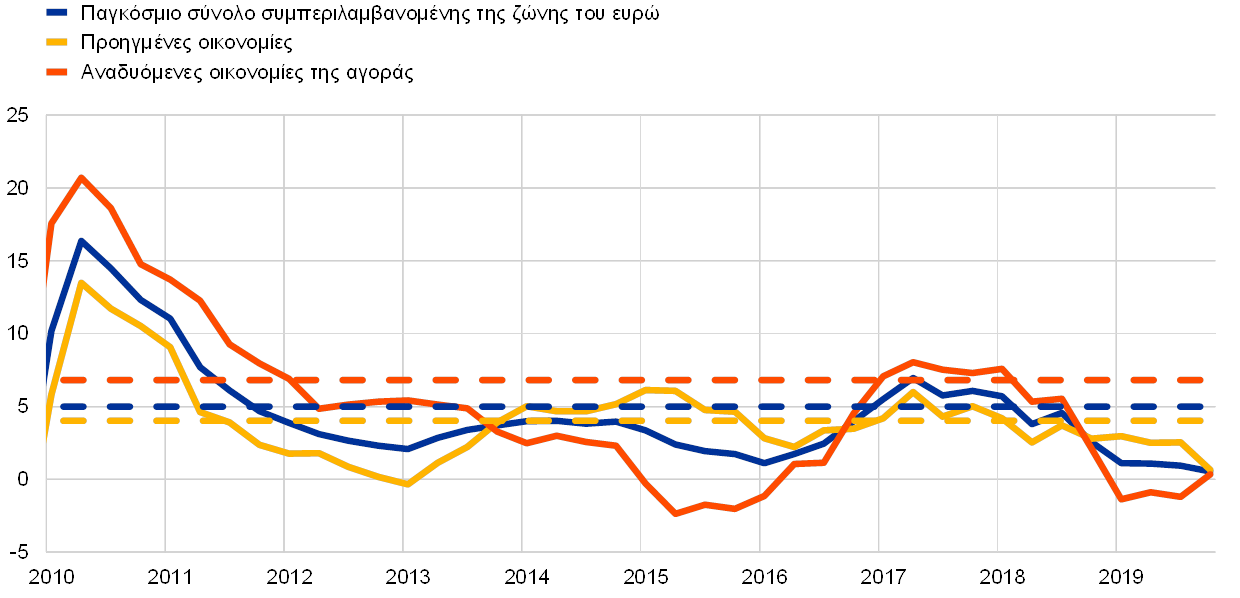 Σημειώσεις: Η αύξηση του παγκόσμιου εμπορίου ορίζεται ως η αύξηση των παγκόσμιων εισαγωγών, συμπεριλαμβανομένης της ζώνης του ευρώ. Με συνεχείς γραμμές παρουσιάζονται τα στοιχεία έως και το δ΄ τρίμηνο του 2019. Με διακεκομμένες γραμμές παρουσιάζονται οι μακροχρόνιοι μέσοι όροι της περιόδου μεταξύ δ΄ τριμήνου 1999 και δ΄ τριμήνου 2019. Πιο πρόσφατες παρατηρήσεις: 10 Μαρτίου 2020.