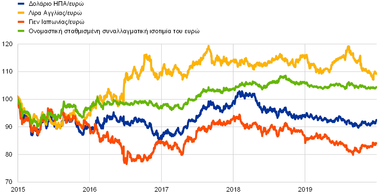 Το ευρώ υποτιμήθηκε κατά 1,6% σε όρους ονομαστικής σταθμισμένης συναλλαγματικής ισοτιμίας στη διάρκεια του 2019 (βλ. Διάγραμμα 4). Σε διμερείς όρους, αυτό οφείλεται στην υποτίμηση του ευρώ έναντι του δολαρίου ΗΠΑ και του γιεν Ιαπωνίας. Η συναλλαγματική ισοτιμία του ευρώ έναντι της λίρας Αγγλίας υποχώρησε επίσης, αλλά επέδειξε σημαντική μεταβλητότητα σε όλη τη διάρκεια του 2019 κυρίως λόγω των εκάστοτε εξελίξεων στο θέμα του Brexit.