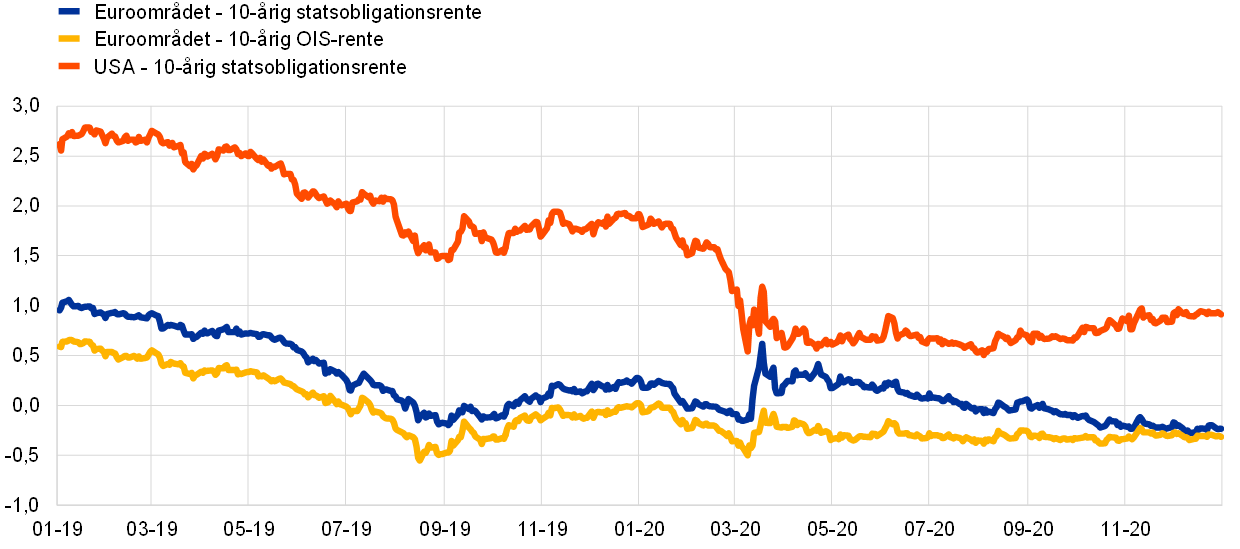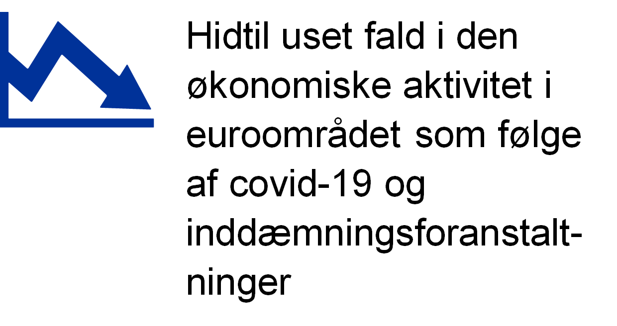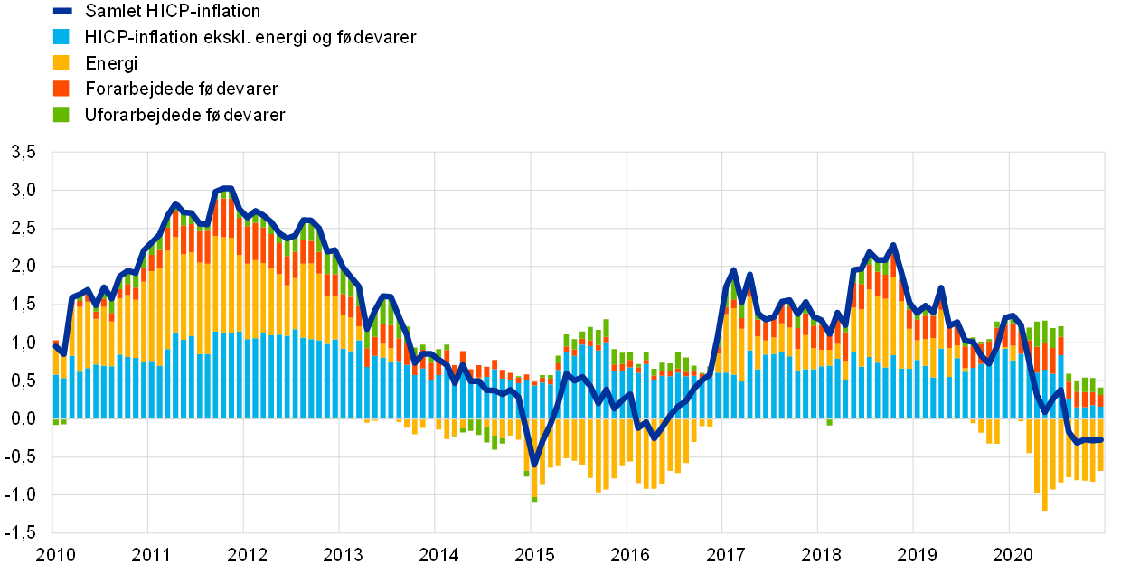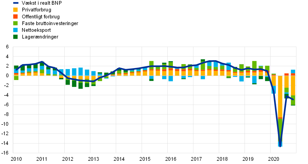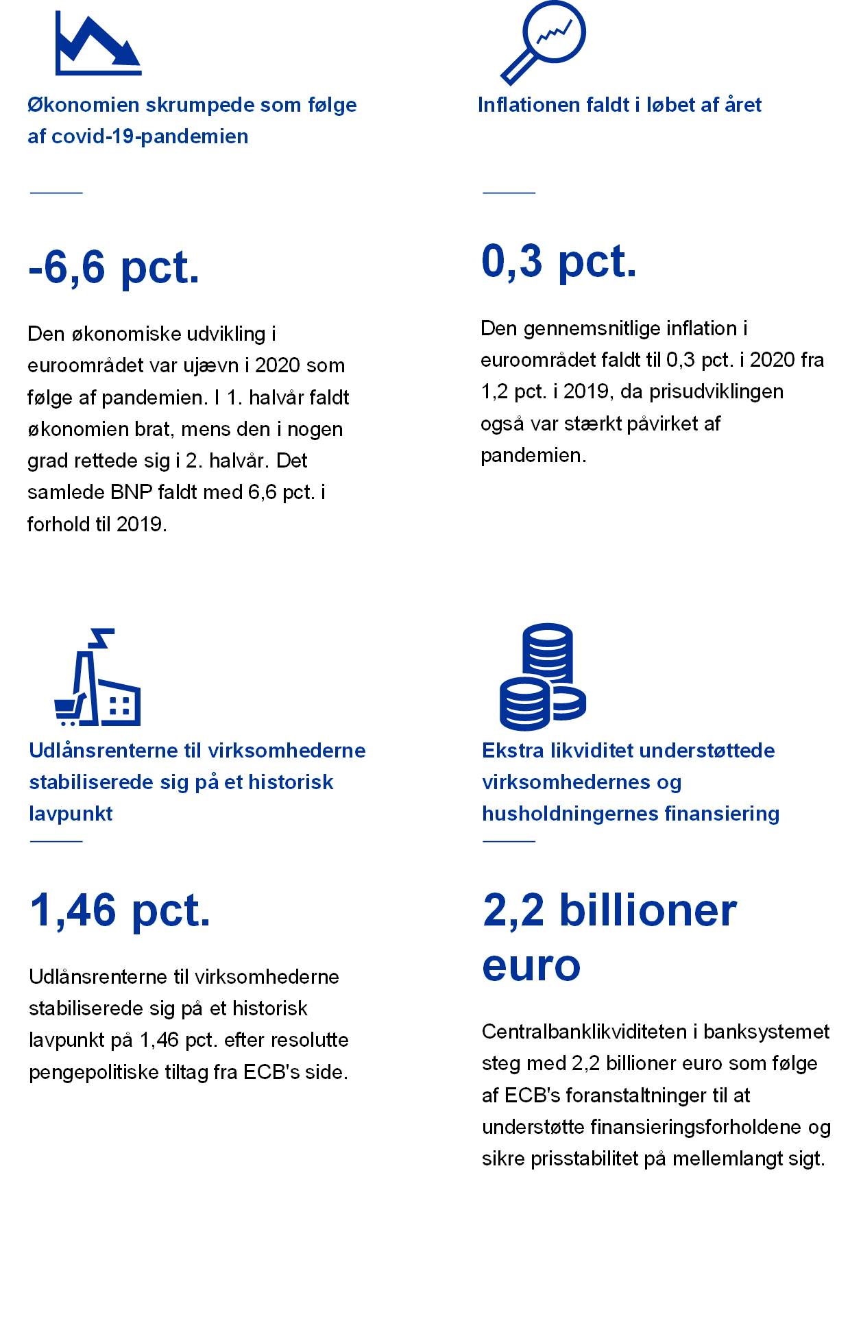 Økonomien i euroområdet blev udsat for et ekstraordinært hårdt stød fra coronapandemien i 2020. Den økonomiske aktivitet faldt kraftigt i løbet af årets første halvdel som følge af nedlukningsforanstaltninger og øget risikoaversion. Den kraftige og koordinerede penge- og finanspolitiske reaktion bidrog – sammen med positive nyheder om vacciner – til at stabilisere aktiviteten i årets anden halvdel. Alt i alt faldt euroområdets BNP med 6,6 pct. i 2020. Den samlede årlige inflation faldt til 0,3 pct. (fra 1,2 pct. i 2019), hvilket for størstedelens vedkommende skyldtes faldende energipriser, men også i nogen udstrækning faktorer i tilknytning til pandemien. Eksempelvis bidrog de sektorer, der var hårdest ramt af krisen, fx transport- og hotelbranchen, til nedgangen i inflationen i årets anden halvdel.