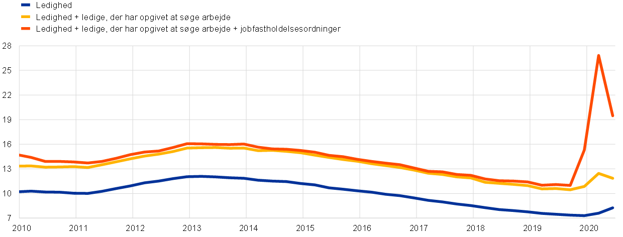 Pandemikrisen har påvirket arbejdsmarkedet i euroområdet i betydelig grad. Ledighedsprocenten i euroområdet (se figur A, blå linje) har reageret afdæmpet i forhold til nedgangen i den økonomiske aktivitet og afspejler ikke i fuldt omfang covid-19's indvirkning på arbejdsmarkedet. Med henblik på bedre måling af underudnyttelsen af arbejdskraften under pandemikrisen kan standardledighedsprocenten tilpasses, så den afspejler antallet af ledige, der har opgivet at søge arbejde, og som ikke er aktive i øjeblikket (se figur A, gul linje). Desuden har pandemikrisen haft en særlig egenskab, nemlig den udbredte brug af jobfastholdelsesordninger, som har bidraget til at beskytte arbejdspladser og reducere arbejdstiden og understøtte arbejdstagernes indkomst. Antallet af arbejdstagere i jobfastholdelsesordninger steg til omkring 30 millioner (ca. 19 pct. af arbejdsstyrken) i april 2020. Når standardledighedsprocenten kombineres med ledige, der har opgivet at søge arbejde, samt med antallet af arbejdstagere i jobfastholdelsesordninger, fås et mere repræsentativt billede af underudnyttelsen af arbejdskraften.