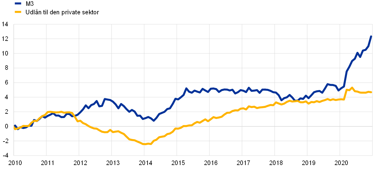 Euroområdets økonomi led også under pandemiens intense virkninger. Virkningen viste sig fx i forbruget, der faldt brat i 1. halvår som følge af omfattende nedlukningsforanstaltninger og øget risikoaversion. Aktiviteten, navnlig i servicesektoren, svækkedes også markant som følge af manglende efterspørgsel og indførelse af restriktioner. Det fik det reale BNP til at falde ekstraordinært hurtigt i 2. kvartal. Samtidig handlede de penge- og finanspolitiske beslutningstagere omgående og resolut for at håndtere den kollapsede efterspørgsel og de høje usikkerhedsniveauer ved bl.a. at sikre gunstige og stabile finansieringsforhold og fortsat adgang til likviditet. Lige fra begyndelsen af covid-19-krisen spillede udsigterne til medicinske løsninger, især en vaccine, en central rolle i forventningerne vedrørende recessionens dybde og varighed. Positive nyheder i slutningen af efteråret om fremskridt inden for udvikling af vacciner førte, sammen med stærke og koordinerede pengepolitiske tiltag, til en gradvis genopretning af tilliden. Væksten var fortsat volatil i 2. halvår, hvor en ny smittebølge ramte, men vækstforventningerne etablerede sig og stabiliserede sig. Prisudviklingen var også kraftigt påvirket af pandemien. Som følge af svigtende efterspørgsel, lavere oliepriser og svækket aktivitet faldt HICP-inflationen i årets løb og lå i det negative område fra august og frem. Andre faktorer, fx den midlertidige momsnedsættelse i Tyskland i 2. halvår, havde også en nedadrettet virkning på inflationen. Samtidig blev udsigterne til højere inflation understøttet af forventningerne om en solid genopretning i 2021 og om, at midlertidige faktorer som den tyske momsnedsættelse ikke længere vil gøre sig gældende. Resolutte pengepolitiske tiltag betød, at kredit- og finansieringsforholdene fortsat virkede understøttende og stort set modvirkede stramningseffekten på bankernes kreditstandarder fra det forværrede risikomiljø. Selv om den markedsforskydning, som det pandemirelaterede stød gav anledning til, medførte en kraftig stramning af de finansielle forhold i marts, bidrog hurtige pengepolitiske tiltag til et samlet fald i statsobligationsrenterne i euroområdet i 2020 og til den gradvise genopretning af aktiekurserne i euroområdet i 2. halvår i forhold til lavpunkterne under pandemien. Perioden med stor usikkerhed medførte også en højere vækst i pengemængden og højere kreditvækst, som afspejlede virksomhedernes og husholdningernes udprægede præference for likviditet samt opbygning af likviditet.