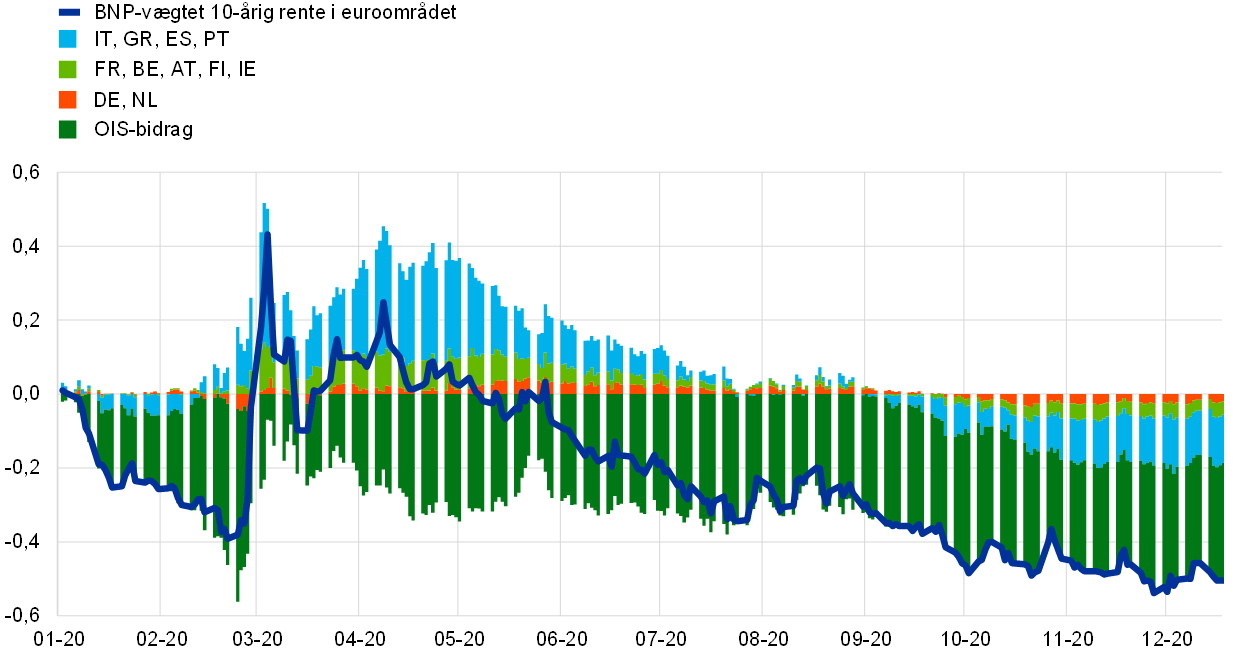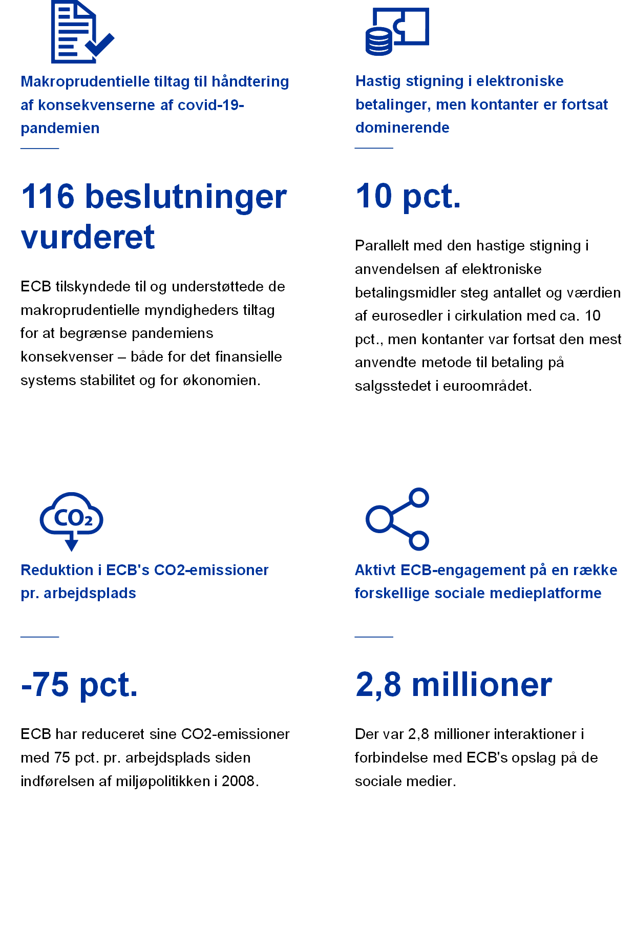 ECB lempede pengepolitikken betydeligt for at imødegå pandemiens negative indvirkning på økonomien i euroområdet. Dette skete ved hjælp af en bred vifte af foranstaltninger, som blev justeret i løbet af året. De omfattede indførelsen af PEPP, et nyt midlertidigt opkøbsprogram på foranledning af den pandemiske nødsituation, en lempelse af belånbarheds- og sikkerhedsstillelseskriterierne og nye langfristede markedsoperationer. Den pengepolitiske reaktion var en meget vigtig stabiliserende faktor for markederne og bidrog til at imødegå de alvorlige risici, som pandemien udgjorde for den pengepolitiske transmissionsmekanisme, udsigterne for økonomien i euroområdet og i sidste instans ECB's målsætning om prisstabilitet. Hertil kommer, at de makroprudentielle politikker satte fokus på at bevare strømmen af kreditgivning til økonomien, samtidig med at ECB Banktilsyn indførte mikroprudentielle foranstaltninger til at afbøde effekten af krisen og øge modstandskraften i den europæiske banksektor.