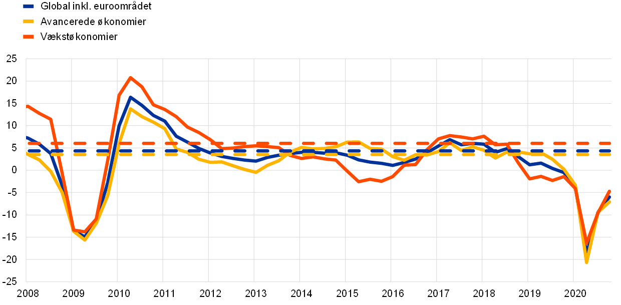 Anm.: Global handelsvækst er defineret som vækst i den globale import, inkl. euroområdet. De fuldt optrukne linjer angiver data frem til 4. kvt. 2020. De stiplede linjer angiver det langsigtede gennemsnit (mellem 4. kvt.1999 og 4. kvt. 2020). De seneste observationer er for 25. februar 2021.