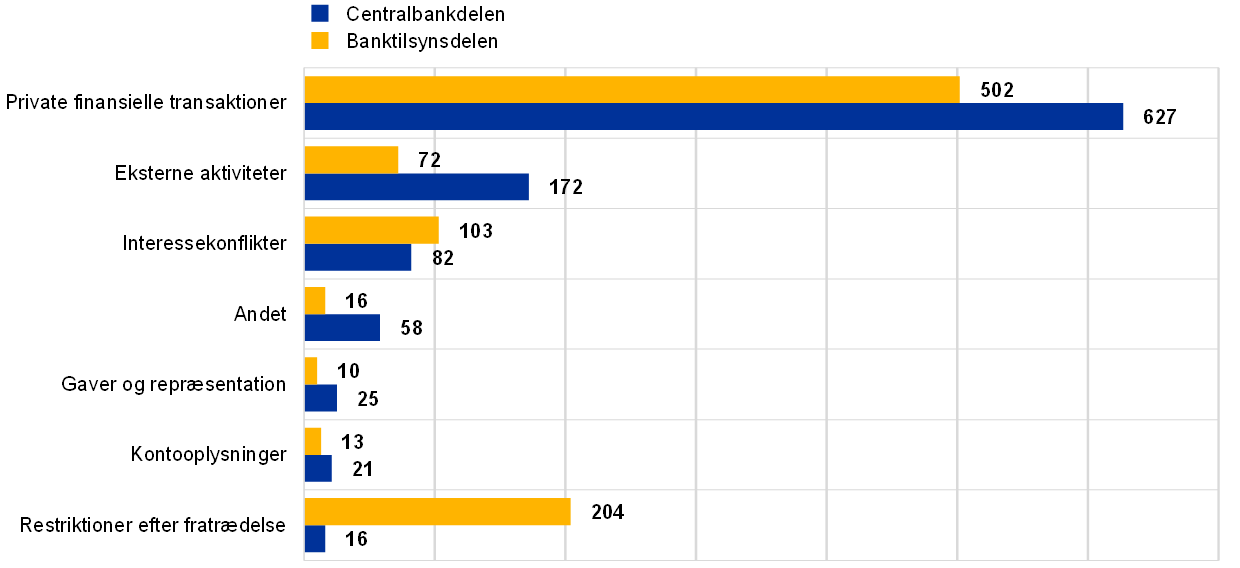 For at holde medarbejderne orienteret om de etiske regler og bestemmelser blev der internt i ECB taget nye initiativer og gennemført oplysningskampagner, og alle nyansatte medarbejdere gennemgår nu et obligatorisk e-læringsprogram med titlen "Being ethical". Compliance og Governance-kontoret besvarede over 1.900 anmodninger om en lang række emner i 2020. Anmodningerne var ligeligt fordelt mellem centralbank- og banktilsynspersonalet. Næsten 60 pct. af anmodningerne vedrørte medarbejdernes private finansielle transaktioner. Herefter kom anmodninger om restriktioner efter fratrædelse og interessekonflikter (se figur 25). Den kontrol, som blev gennemført med ekstern bistand, bekræftede, at ECB's medarbejdere og medlemmerne af ECB's organer på højt niveau generelt overholder reglerne for private finansielle transaktioner.
