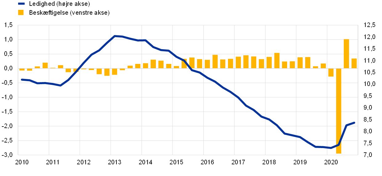 Beskæftigelsen faldt med 1,9 pct. i 2020, mens ledigheden steg til 8,4 pct. Ledighedsprocenten steg mindre end under tidligere recessioner, fx i 2008-09 og 2011-12, også takket være eurolandenes rettidige og omfattende respons. Samtidig var produktivitetsvæksten pr. time omkring 1 pct. i gennemsnit i 2020 og blev holdt oppe af det betydelige fald i arbejdstimer, der skyldtes anvendelsen af jobfastholdelsesordninger.