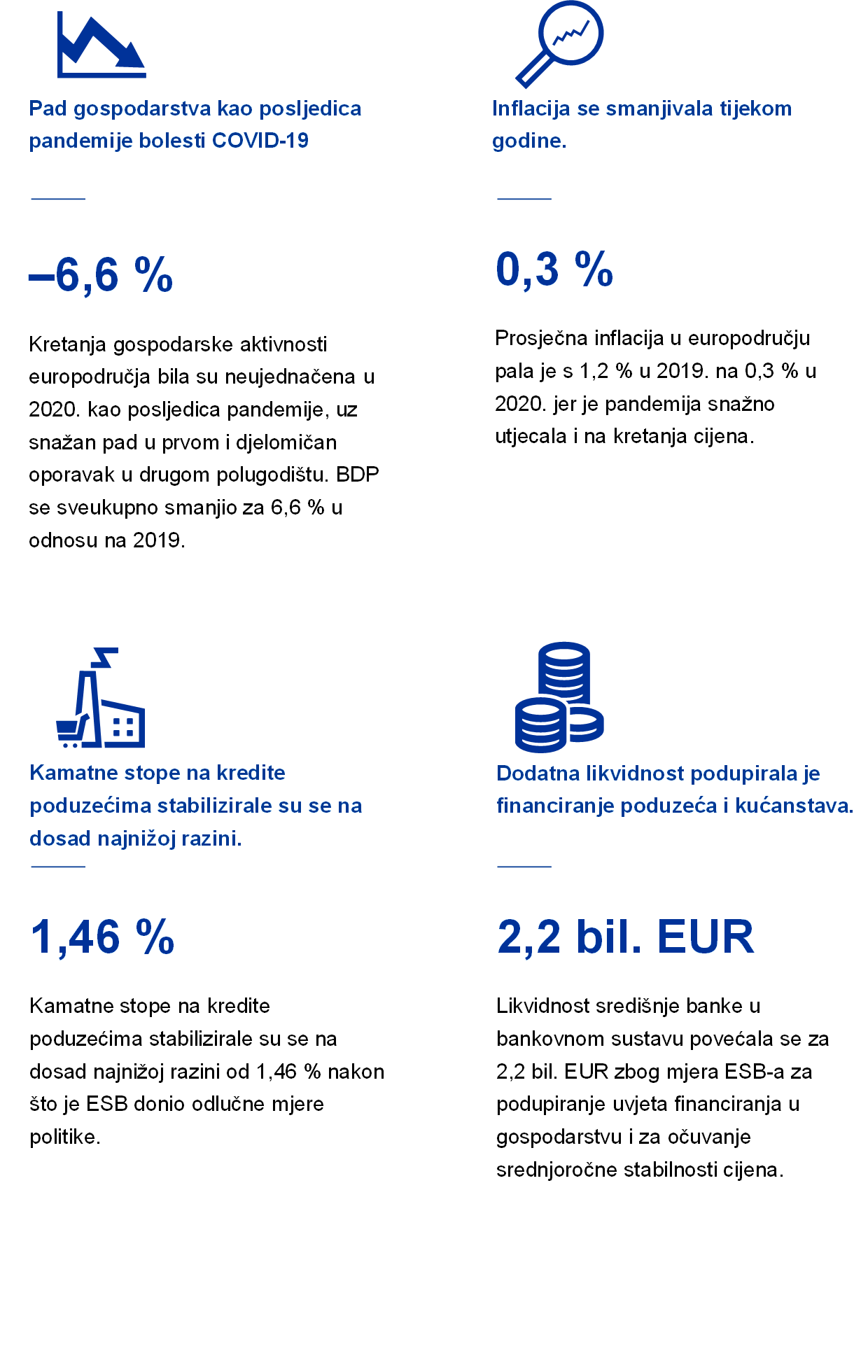 Gospodarstvo europodručja u 2020. pogodio je izniman, težak šok prouzročen pandemijom bolesti COVID‑19. Zbog mjera zatvaranja i povećane nesklonosti riziku gospodarska aktivnost znatno se smanjila u prvoj polovini godine. Snažan, usklađen odgovor monetarne i fiskalne politike te pozitivne novosti o cjepivima pridonijeli su stabiliziranju aktivnosti u drugoj polovini godine. Općenito gledajući, BDP europodručja smanjio se za 6,6 % u 2020. Godišnja ukupna inflacija smanjila se s 1,2 % u 2019. na 0,3 %. Smanjenje je u velikoj mjeri posljedica pada cijena energije, premda su na njega utjecali i čimbenici povezani s pandemijom. Primjerice, sektori najjače pogođeni krizom, kao što su prijevozni sektor i hotelijerstvo, pridonijeli su padu inflacije u drugoj polovini godine.