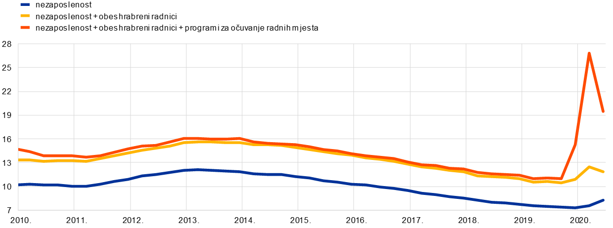 Kriza uzrokovana pandemijom imala je znatan učinak na tržište rada europodručja. Stopa nezaposlenosti u europodručju (vidi Grafikon A, plava linija) slabije reagira u odnosu na smanjenje gospodarske aktivnosti i ne odražava u potpunosti učinak bolesti COVID‑19 na tržište rada. Kako bi se bolje izmjerila neiskorištenost radne snage tijekom krize uzrokovane pandemijom, standardna stopa nezaposlenosti može se prilagoditi tako da odražava broj obeshrabrenih radnika koji su trenutačno neaktivni (vidi Grafikon A, žuta linija). Osim toga, posebno obilježje krize uzrokovane pandemijom bila je raširena primjena programa za očuvanje radnih mjesta, što je pridonijelo zaštiti radnih mjesta i smanjenju broja radnih sati te podupiranju prihoda radnika. Broj radnika obuhvaćenih programima za očuvanje radnih mjesta dosegnuo je oko 30 milijuna (oko 19 % radne snage) u travnju 2020. Kombinacija standardne stope nezaposlenosti i obeshrabrenih radnika te broja radnika obuhvaćenih programima za očuvanje radnih mjesta (vidi grafikon A, crvena linija) stoga daje reprezentativniju sliku stanja neiskorištenosti radne snage.