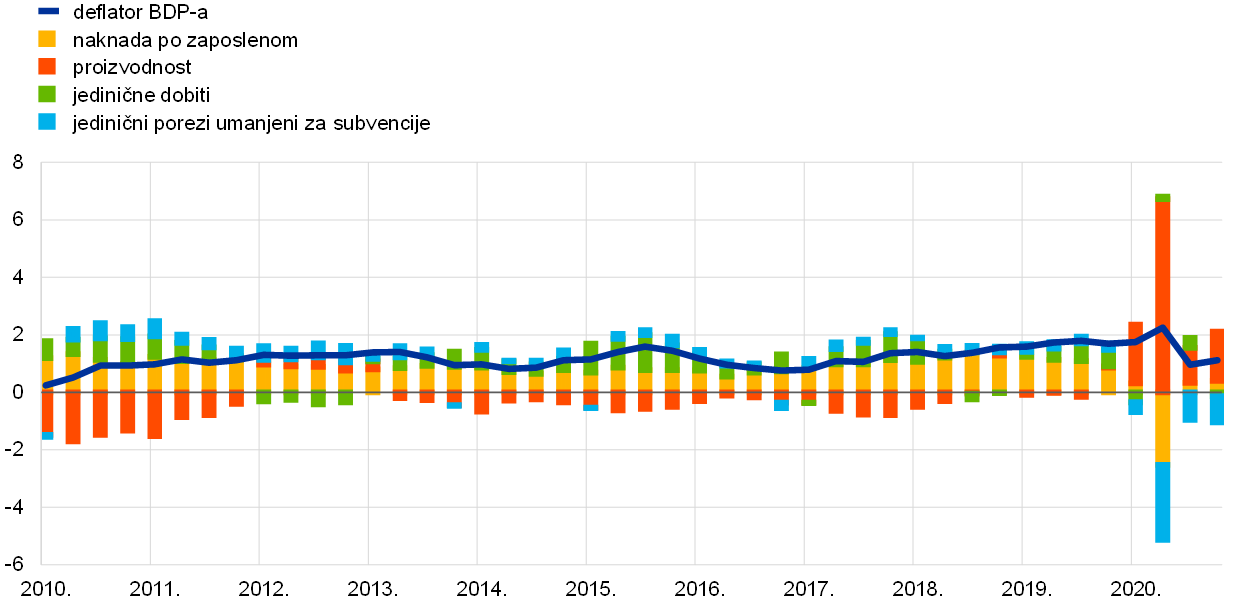 Domaći troškovni pritisci mjereni porastom deflatora BDP‑a rasli su u 2020. po prosječnoj stopi višoj od prosjeka u 2019. (vidi Grafikon 10.). Nasuprot tome, godišnji rast naknade po zaposlenom brzo se smanjivao te je iznosio –0,6 % u 2020., što je znatno niže nego u 2019. Istodobno je još veće smanjenje rasta proizvodnosti upućivalo na znatno povećanje jediničnih troškova rada, što je pridonijelo zabilježenom rastu deflatora BDP‑a. Rast jediničnih troškova rada iznosio je 4,6 % u 2020., što je povećanje u odnosu na 1,9 % u 2019. Međutim, kretanja rasta jediničnih troškova rada, rasta proizvodnosti i rasta naknade po zaposlenom u 2020. bila su pod utjecajem široke primjene programa rada sa skraćenim radnim vremenom, što je, primjerice, dovelo do toga da je zaposlenost bila znatno otpornija od proizvodnje ili stvarno odrađenih sati. Postojali su i problemi povezani sa statističkim bilježenjem tih mjera, što je podrazumijevalo neobično velik doprinos subvencija kretanjima domaćih troškova i ometalo usporedivost novijih i prošlih kretanja.[13] Primjerice, na strani rashoda takva statistička pitanja bila su vidljiva u naglom povećanju stope rasta deflatora državne potrošnje u drugom tromjesečju.