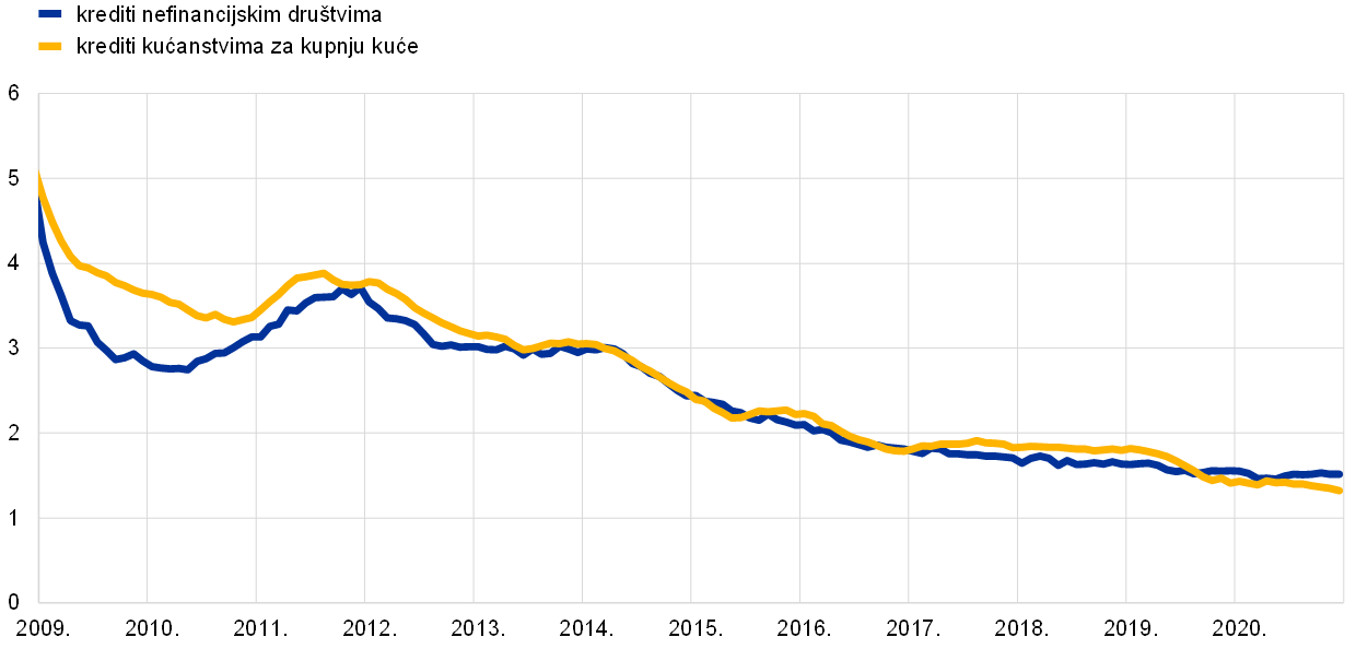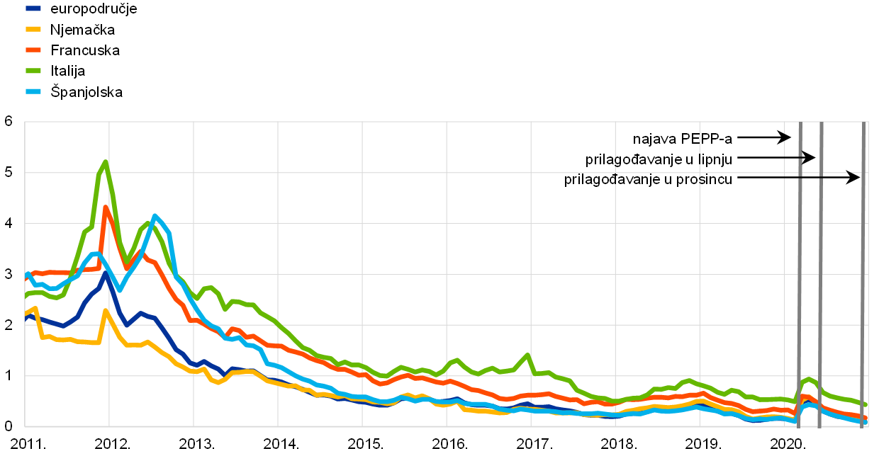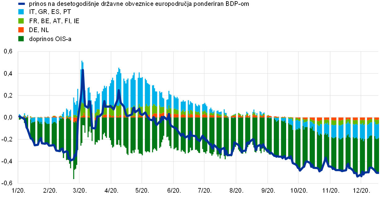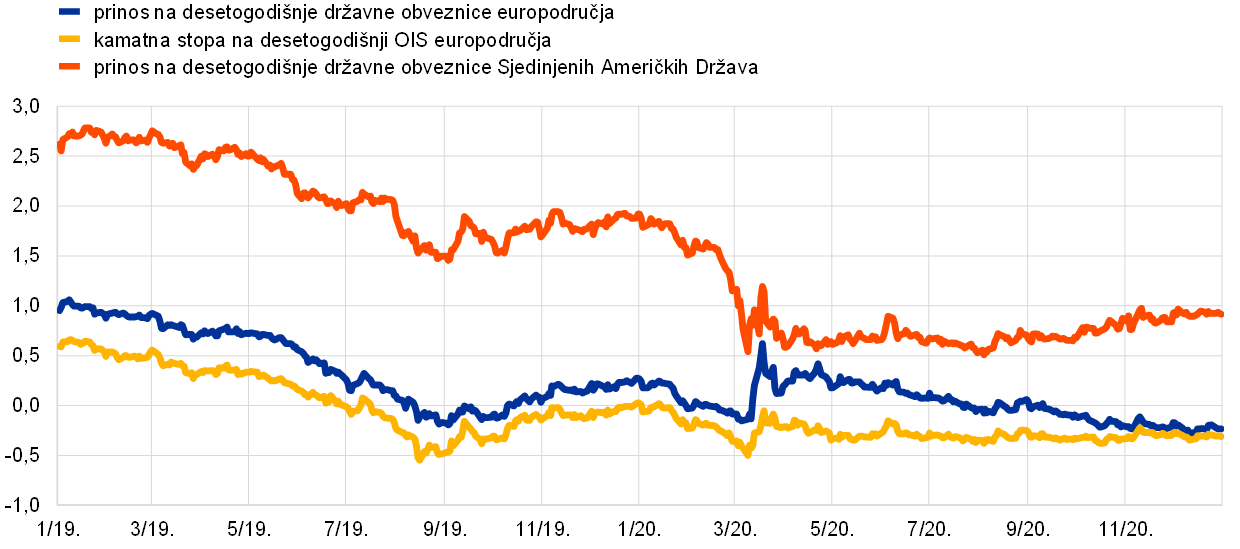 Gospodarstvo europodručja također je bilo pod snažnim nepovoljnim utjecajem pandemije. Taj utjecaj vidljiv je, primjerice, u potrošnji, koja se naglo smanjila u prvoj polovini godine kao posljedica dalekosežnih mjera zatvaranja i povećane nesklonosti riziku. Aktivnost, posebice u sektoru usluga, također je znatno oslabjela zbog nedostatka potražnje i ograničenja aktivnosti. Zbog toga se realni BDP smanjivao iznimno brzim tempom u drugom tromjesečju. Istodobno su nositelji monetarnih i fiskalnih politika djelovali brzo i odlučno kako bi riješili problem urušavanja potražnje i visokih razina neizvjesnosti, među ostalim, osiguravajući povoljne i stabilne uvjete financiranja i kontinuirani pristup likvidnosti. Od početka krize uzrokovane koronavirusom očekivanja glede dubine i trajanja recesije bila su pod velikim utjecajem izgleda za pronalaženje medicinskih rješenja, posebice cjepiva. Uz snažne i koordinirane mjere politike, pozitivne vijesti u kasnu jesen u vezi s napretkom u razvoju cjepiva dovele su do postupne obnove povjerenja. Kretanja rasta ostala su kolebljiva u drugoj polovini godine kada je došlo do novog vala širenja zaraze, a očekivanja glede rasta učvrstila su se i stabilizirala. I kretanja cijena bila su pod snažnim utjecajem pandemije. Zbog posustale potražnje, nižih cijena nafte i oslabljene aktivnosti inflacija mjerena HIPC‑om smanjivala se tijekom godine i bila je na negativnoj razini od kolovoza nadalje. Ostali činitelji, kao što je privremeno smanjenje njemačke stope PDV‑a u drugoj polovini godine, također su doveli do smanjenja inflacije. Istodobno su se izgledi za povećanje inflacije zasnivali na očekivanjima glede solidnog oporavka u 2021. i ukidanja privremenih činitelja, kao što je smanjenje njemačke stope PDV‑a. Odlučnim mjerama politike očuvani su pogodni uvjeti kreditiranja i financiranja te je uvelike poništen utjecaj pooštravanja kreditnih standarda banaka koje je bilo posljedica pogoršanja u okružju rizika. Iako je zbog poremećaja na tržištu nastalih zbog pandemijskog šoka došlo do snažnog pooštravanja financijskih uvjeta u ožujku, brzo djelovanje politike pridonijelo je ukupnom smanjenju prinosa na državne obveznice europodručja u 2020. i postupnom oporavku cijena vlasničkih vrijednosnih papira u europodručju u drugoj polovini godine u odnosu na najniže razine tijekom pandemije. Razdoblje velike neizvjesnosti dovelo je i do ubrzavanja rasta novčane mase i kredita, što je odražavalo snažnu sklonost poduzeća i kućanstava prema likvidnosti i njezino povećanje.