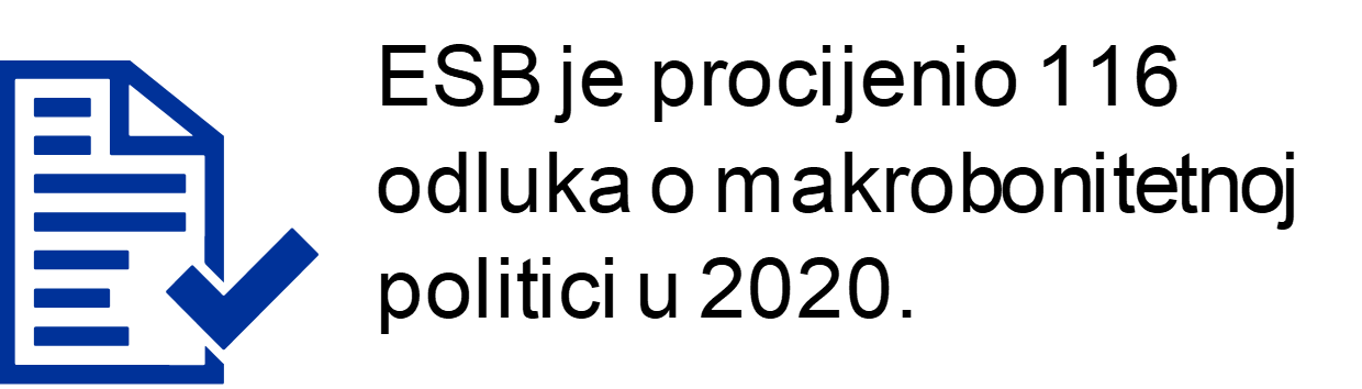 Kako bi neutralizirao negativan učinak pandemije na gospodarstvo europodručja, ESB je znatno ublažio stajalište monetarne politike poduzimanjem sveobuhvatnog skupa mjera koje su prilagođavane tijekom godine. Među tim mjerama bili su uvođenje novoga, privremenoga hitnog programa kupnje zbog pandemije, popuštanje kriterija povezanih s prihvatljivošću imovine i kolateralom te ponuda novih operacija dugoročnijeg refinanciranja. Odgovor monetarne politike bio je ključan za stabiliziranje tržišta i pridonio je umanjenju ozbiljnih rizika za transmisiju monetarne politike, za izglede za gospodarstvo europodručja i, naposljetku, za ESB‑ov cilj stabilnosti cijena, koji su proizišli iz pandemije. Osim toga, makrobonitetne politike bile su usmjerene na održavanje toka kredita prema gospodarstvu, a nadzor banaka ESB‑a donio je mikrobonitetne mjere za ublažavanje učinka krize i promicanje otpornosti europskoga bankarskog sektora.