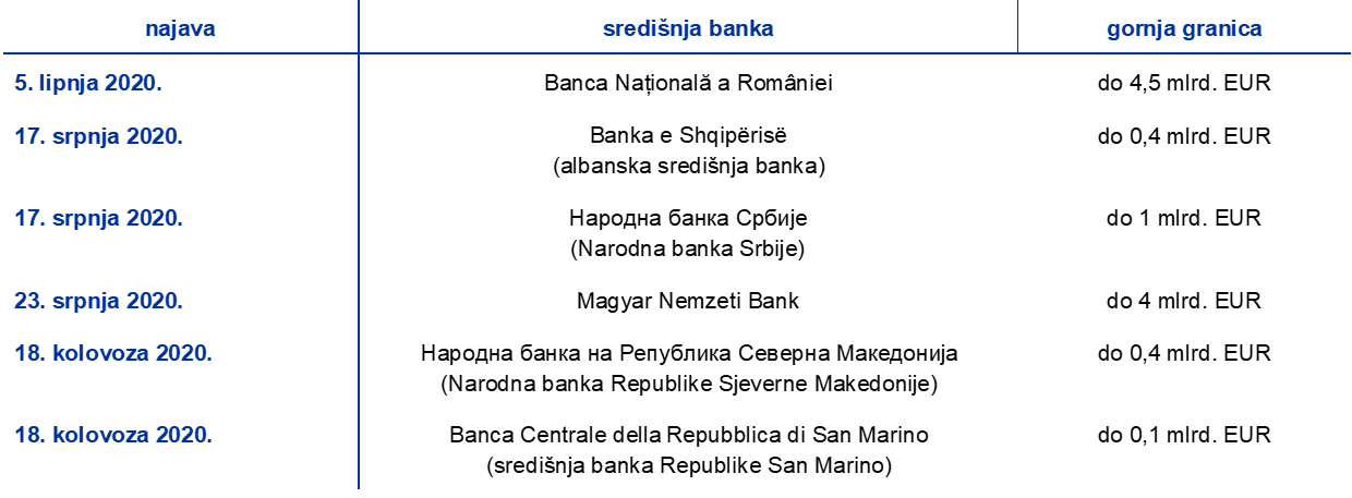 - Vidi i Panetta, F. i Schnabel, I., „The provision of euro liquidity through the ECB’s swap and repo operations ”, ESB‑ov blog, ESB, 19. kolovoza 2020.