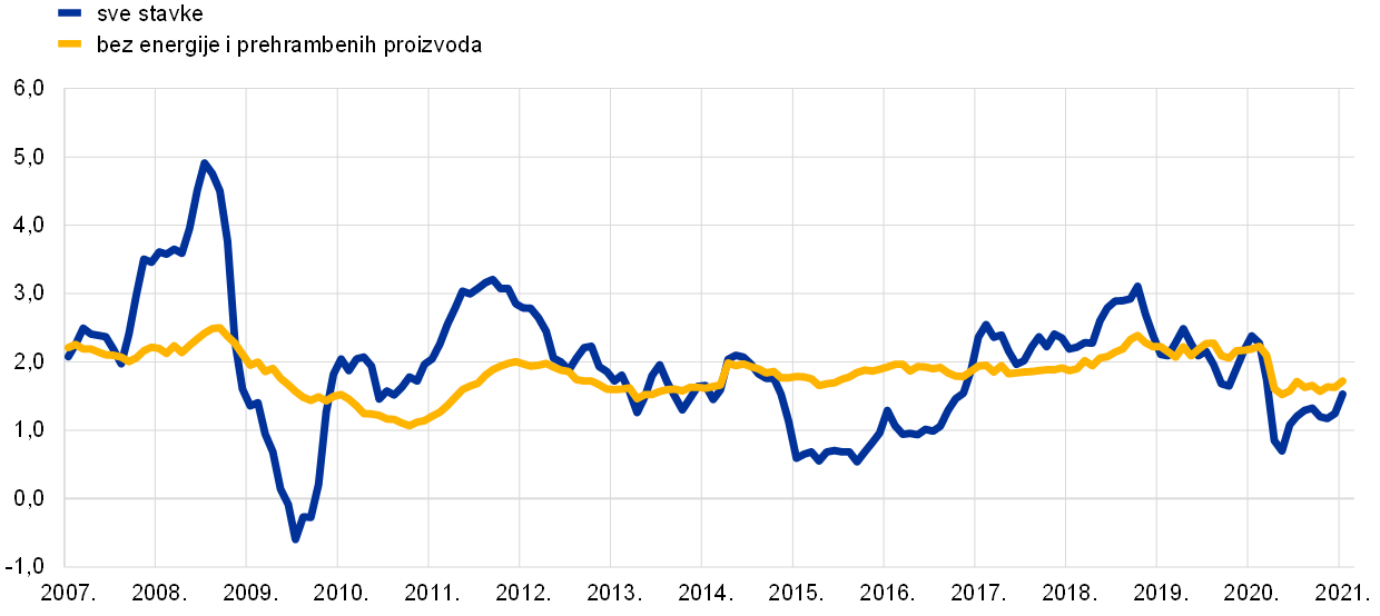 Kretanja inflacije cijena energije uvelike su pridonijela smanjenju prosječne ukupne inflacije u 2020. u odnosu na 2019., što je odraz pada cijena nafte na početku pandemije. S druge strane, doprinos ukupne inflacije cijena prehrambenih proizvoda ukupnoj inflaciji mjerenoj HIPC‑om blago se povećao na 0,4 postotna boda u 2020., na razinu nešto višu od one iz 2019., što uglavnom odražava činjenicu da se posebice inflacija cijena neprerađenih prehrambenih proizvoda privremeno znatno povećala tijekom pandemije (uz vrhunac od 7,6 % u travnju 2020.).[11]