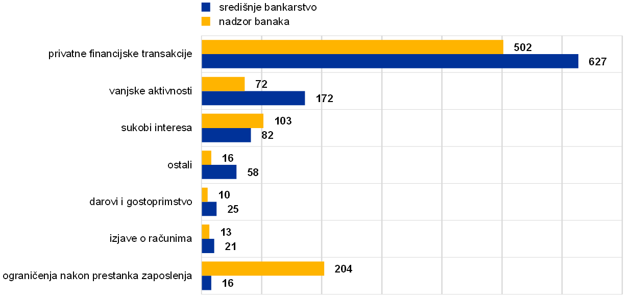 Unutar ESB‑a razvijene su nove inicijative i komunikacijske kampanje za informiranje osoblja o etičkim pravilima i odredbama, a svi su novozaposleni članovi osoblja obvezni proći program e‑učenja pod nazivom „Biti etičan”. Služba za usklađenost s propisima i upravljanje odgovorila je na više od 1900 zahtjeva o širokom rasponu tema u 2020., a zahtjevi su podjednako podijeljeni između osoblja za središnje bankarstvo i osoblja za nadzor banaka. Gotovo 60 % zahtjeva odnosilo se na privatne financijske transakcije članova osoblja, a slijedili su zahtjevi o vanjskim aktivnostima i pitanjima sukoba interesa (vidi Grafikon 25.). Provjerama usklađenosti provedenima uz potporu vanjskog pružatelja usluga potvrđeno je da članovi osoblja ESB‑a i članovi ESB‑a u tijelima na visokoj razini općenito poštuju pravila o privatnim financijskim transakcijama.