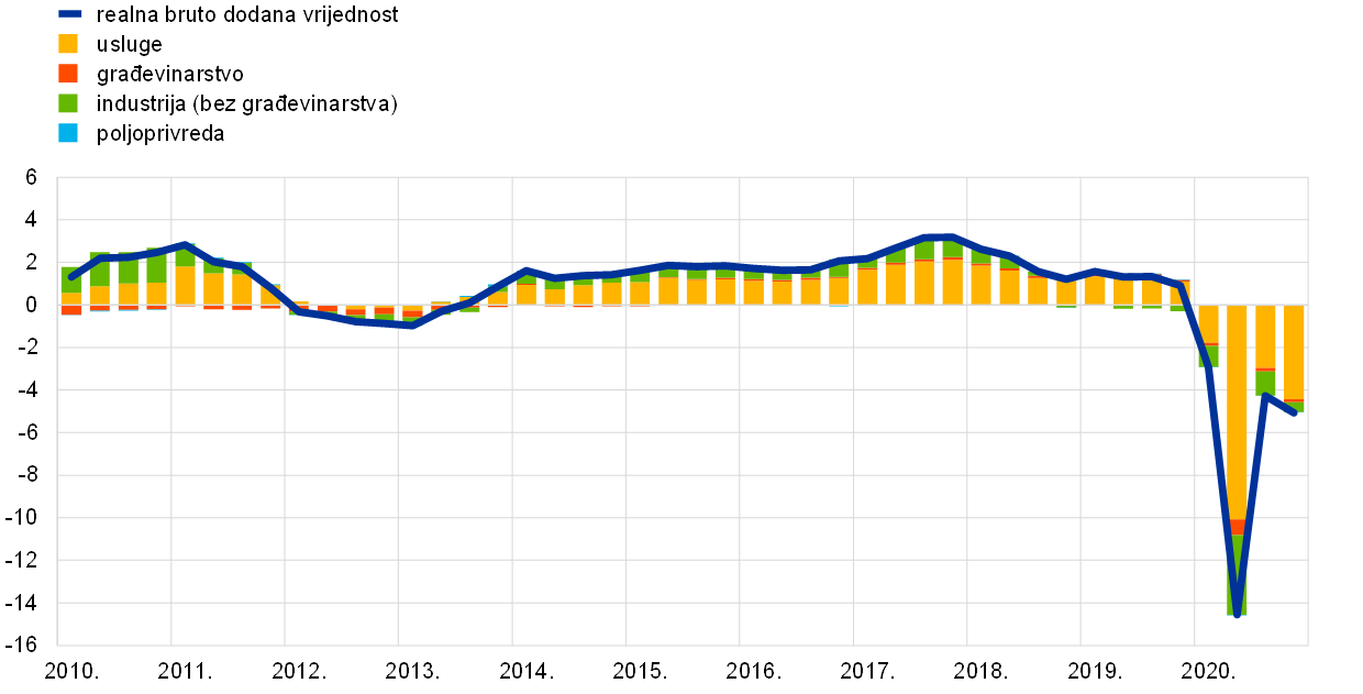 Utjecaj bolesti COVID‑19 na rast proizvodnje također je bio neujednačen među sektorima, pri čemu je sektor usluga najviše pridonio padu realne bruto dodane vrijednosti, što odražava njegovu posebnu izloženost mjerama ograničavanja fizičkih kontakata kao i sektorski sastav gospodarstva europodručja (vidi Grafikon 5.).