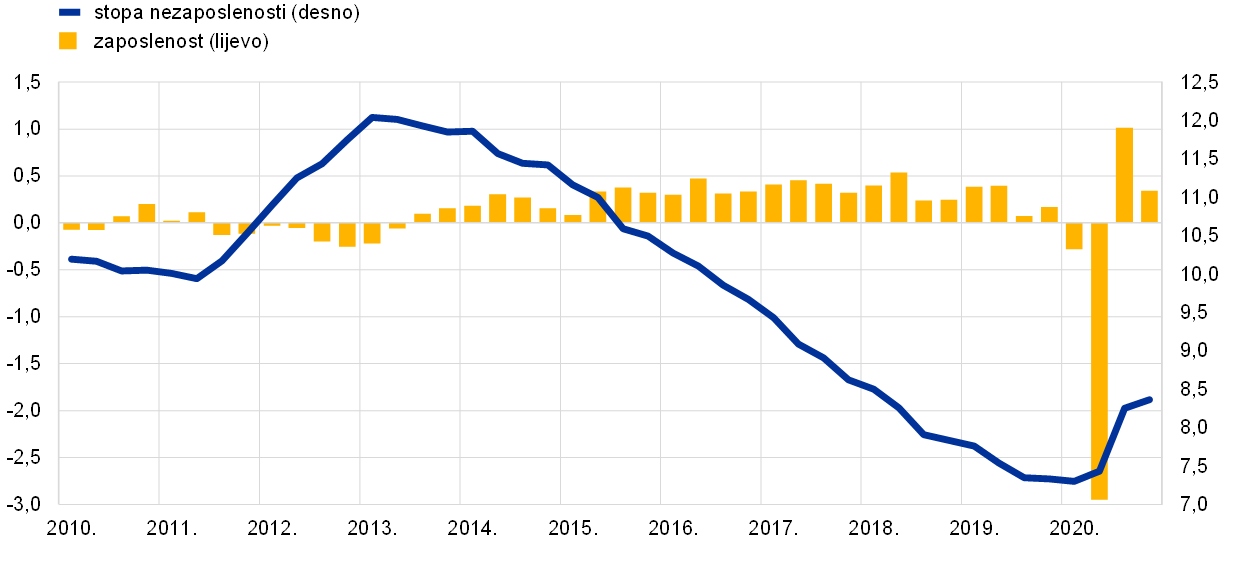 Zaposlenost se smanjila za 1,9 % u 2020., a stopa nezaposlenosti porasla je na 8,4 %. Porast stope nezaposlenosti bio je manji nego u prethodnim recesijama, primjerice u 2008. i 2009. te 2011. i 2012., zahvaljujući i pravodobnom i opsežnom odgovoru vlada država europodručja. Istodobno je rast proizvodnosti rada po satu iznosio prosječno 1 % u 2020., a ublažen je znatnim smanjenjem radnih sati zbog primjene programa za očuvanje radnih mjesta.