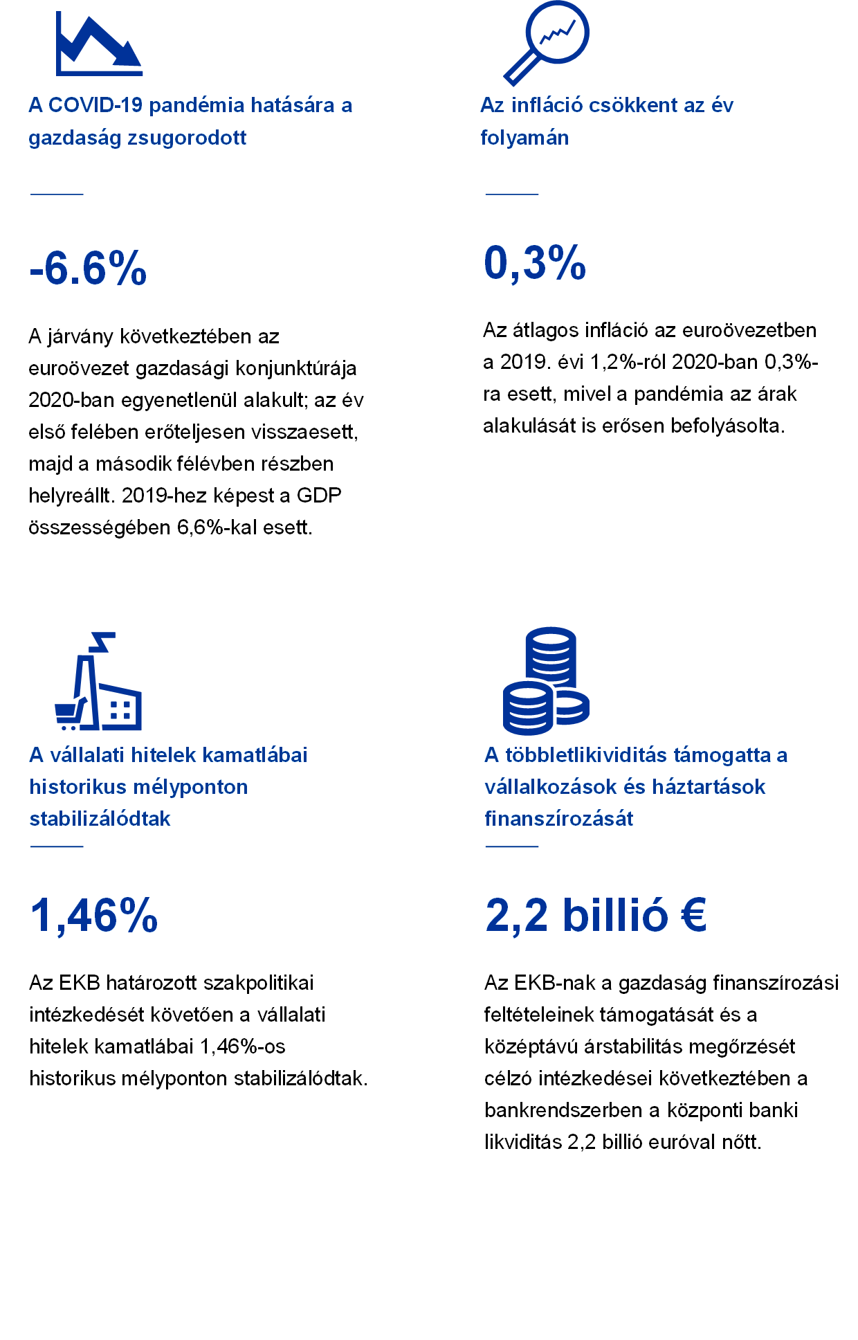 Az euroövezet gazdaságát 2020-ban a koronavírus- (Covid19-) világjárvány miatt rendkívüli és súlyos megrázkódtatás érte. A kijárást korlátozó intézkedések és a fokozott kockázatkerülés következményeként az év első felében a gazdaság jelentősen visszaesett. Az év második felében azonban az erőteljes és összehangolt monetáris és fiskális politikai reakció – az oltással kapcsolatos pozitív hírekkel társulva – segített stabilizálni a gazdaságot. 2020 egészét tekintve 6,6%-kal csökkent az euroövezeti GDP. Az éves HICP-infláció nagyrészt a csökkenő energiaárak miatt a 2019. évi 1,2%-ról visszaesett 0,3%-ra, bár a világjárvánnyal kapcsolatos tényezők is szerepet játszottak, a második félévben a válság által leginkább sújtott olyan ágazatok, mint például a közlekedés és a szállodaipar is hozzájárultak az infláció csökkenéséhez.