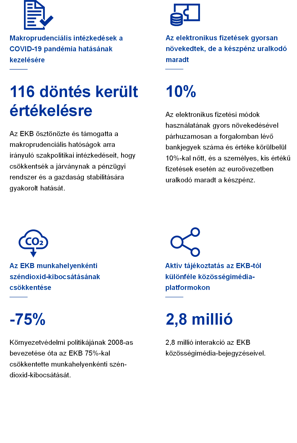 Az EKB 2020-ban kiterjesztette tájékoztatását és lakossági kapcsolatait, hogy megfeleljen a pandémia okozta kihívásoknak, és hogy jobban megértse az európai polgárok gazdasággal kapcsolatos aggodalmait és sürgető igényeit. Elindult az EKB blog is. 2020-ban 19 bejegyzés született, amely közül több elsősorban az EKB-nak a válságra adott reakciójával foglalkozik. „Az EKB meghallgatja Önöket” első rendezvényére 2020 októberében került sor, és a kapcsolódó portálon több mint 4000 hozzászólás érkezett a monetáris politikai stratégiánkkal kapcsolatban.