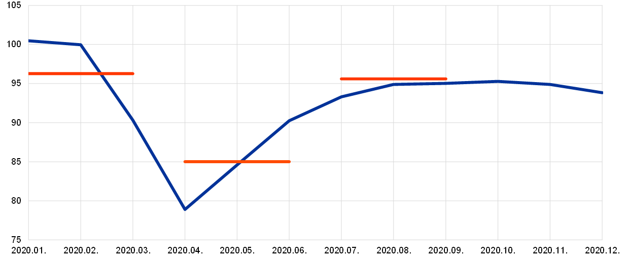 - Lásd az „A preliminary assessment of the impact of the COVID-19 pandemic on the euro area labour market” (A COVID-19 pandémia euroövezeti munkaerőpiacra gyakorolt hatásának előzetes értékelése) című keretes írást, Economic Bulletin, 5. sz., EKB, 2020.