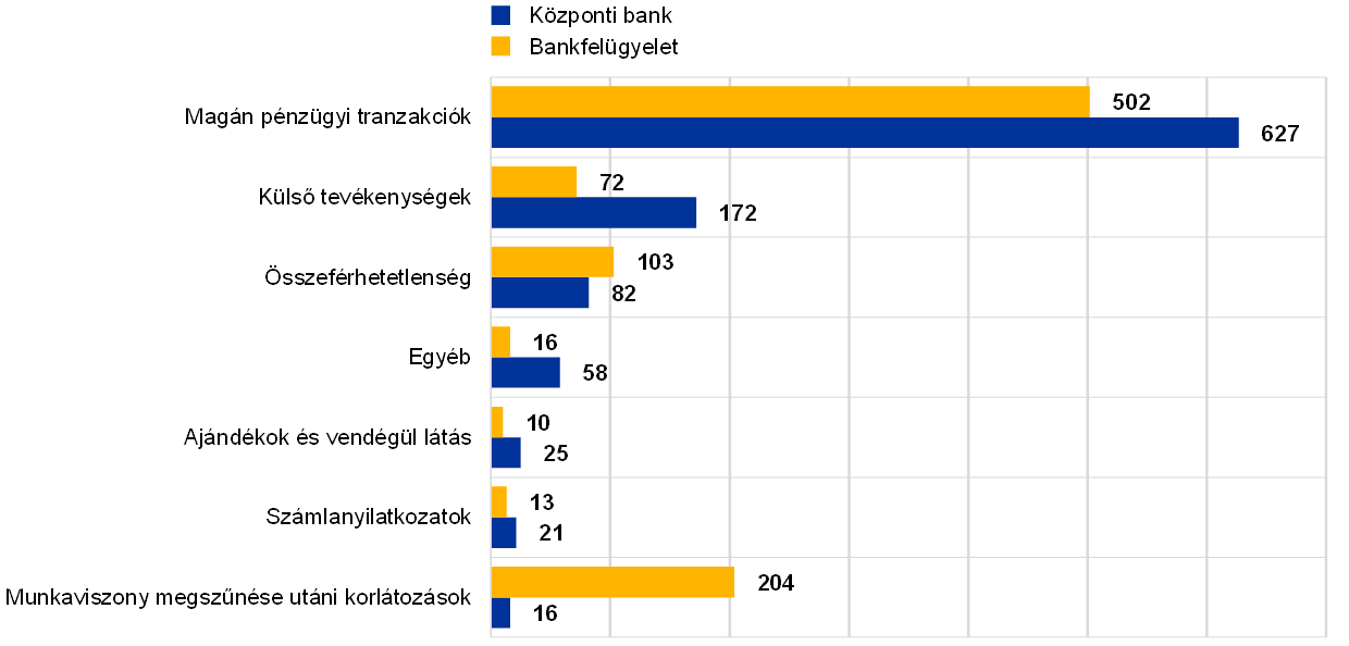 Az EKB-n belül új kezdeményezéseket és kommunikációs kampányokat dolgoztak ki, hogy folyamatosan tájékoztassák a munkatársakat az etikai szabályokról és rendelkezésekről, és minden újonnan felvett dolgozó elvégez egy kötelező etikai távoktatási programot. 2020-ban a Jogkövetési és Szervezetirányítási Iroda témák széles körében több mint 1900 megkeresésre válaszolt, és a megkeresések egyenlő arányban oszlottak meg a központi banki és a bankfelügyeleti dolgozók között. A megkeresések csaknem 60%-a a munkatársak magán pénzügyi tranzakcióira vonatkozott, ezeket követték a külső tevékenységekre és összeférhetetlenségre vonatkozó megkeresések (lásd a 25. ábrát). A jogkövetési ellenőrzések – amelyek egy külső szolgáltató támogatásával zajlottak – igazolták, hogy az EKB munkatársai és a magas szintű testületek EKB által delegált tagjai teljes mértékben betartották a magán pénzügyi tranzakciókra vonatkozó szabályokat.