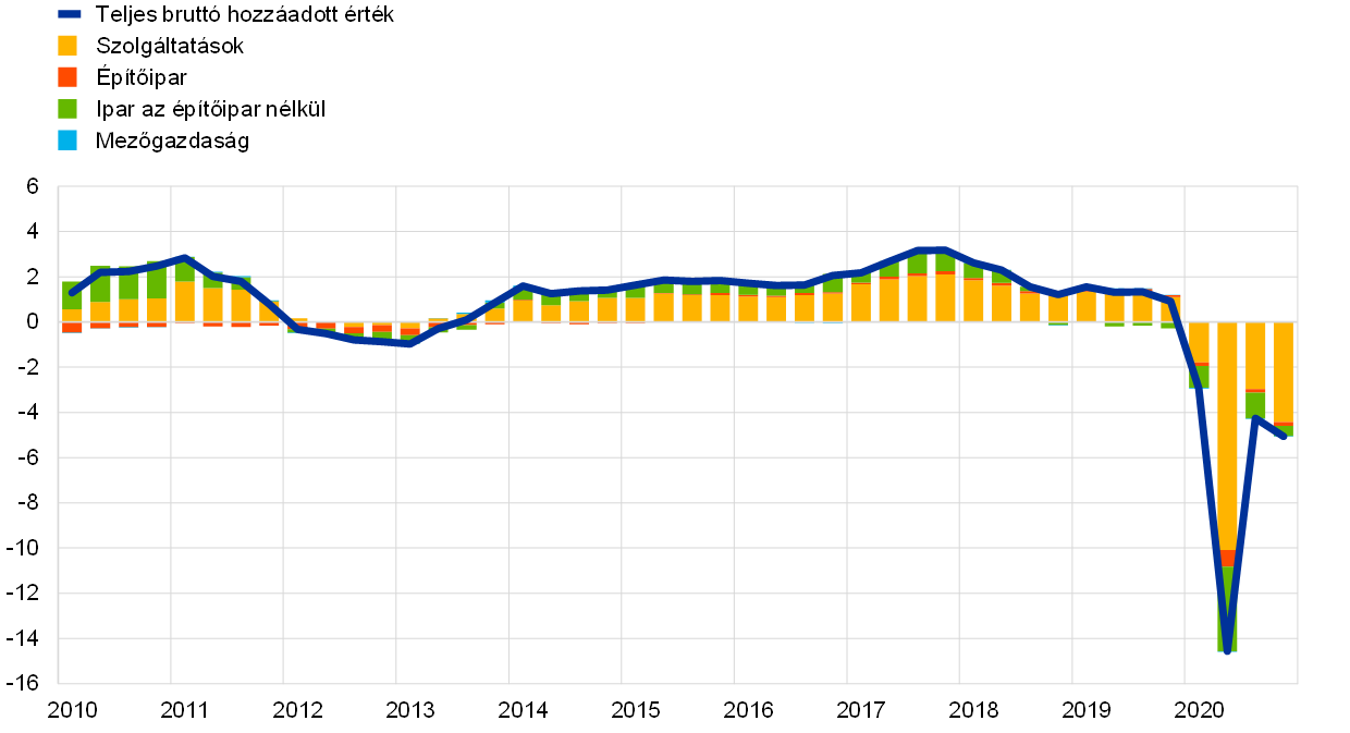 A COVID-19 kibocsátásnövekedésre gyakorolt hatása szektoronként is egyenetlen volt. Leginkább a szolgáltatási szektor járult hozzá a reál bruttó hozzáadott érték eséséhez, tükrözve a közösségi távolságtartási intézkedéseknek való különös kitettségét, valamint az euroövezet gazdaságának ágazati összetételét (lásd az 5. ábrát).