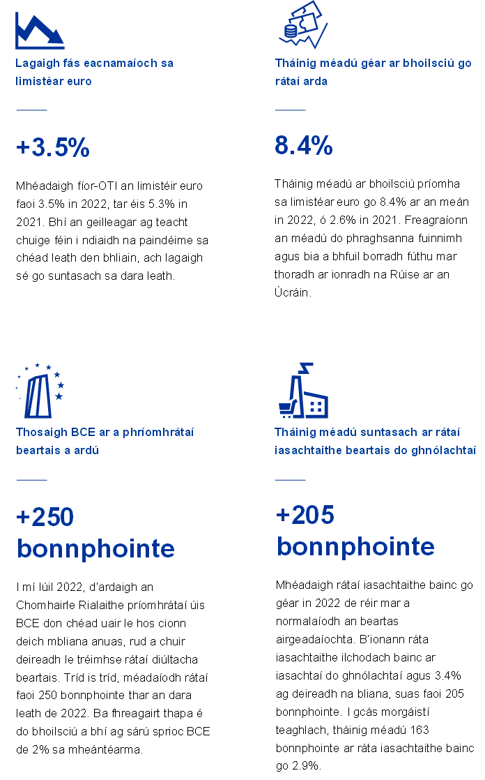 Tháinig moilliú ar an bhfás domhanda in 2022. Bhí ionradh na Rúise ar an Úcráin, boilsciú ard agus dálaí airgeadais níos déine ag cur isteach ar gheilleagair margaidh shárfhorbartha agus ar gheilleagair margaidh éiritheacha araon. Tháinig méadú suntasach ar bhrúnna boilscitheacha domhanda, rud a bhí á spreagadh ag praghsanna arda luaineacha tráchtearraí, ag scrogaill soláthair dhomhanda agus ag margaí teanna saothair. D’éirigh an euro ní ba laige in aghaidh dhollar SA ach tháinig luachmhéadú air in aghaidh go leor airgeadraí eile agus, dá bhrí sin, bhí sé ní ba chobhsaí i dtéarmaí ainmniúla iarbhír.