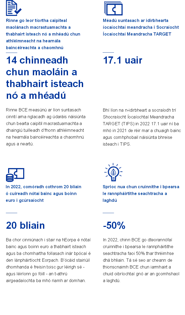 Chomh maith lenár mbearta chun dul i ngleic le boilsciú ard, leanamar ag scrúdú bagairtí níos leithne ar ár sainordú a eascraíonn as aeráid atá ag athrú agus leanamar orainn ag tabhairt aghaidh orthu. In 2022, rinneamar céimeanna breise chun breithnithe maidir leis an athrú aeráide a ionchorprú inár n-oibríochtaí beartais airgeadaíochta. Áiríodh leis sin an chéad tástáil struis aeráide a dhéanamh ar roinnt de na neamhchosaintí airgeadais atá ar ár gclár comhardaithe agus dul chun cinn a dhéanamh maidir le tionchar an athraithe aeráide a ghabháil ar bhealach níos fearr inár samhaltú maicreacnamaíoch. Ó mhí Dheireadh Fómhair, chuireamar tús le dícharbónú a dhéanamh ar na sealúchais bannaí corparáideacha inár bpunanna beartais airgeadaíochta trína gcur i dtreo eisitheoirí a bhfuil feidhmíocht aeráide níos fearr acu. Chinneamar freisin teorainn a chur leis an sciar de shócmhainní arna n-eisiúint ag corparáidí neamhairgeadais a bhfuil lorg ard carbóin acu agus gur féidir le contrapháirtithe iad a ghealladh mar chomhthaobhacht nuair a fhaigheann siad iasachtaí ón Eurochóras.