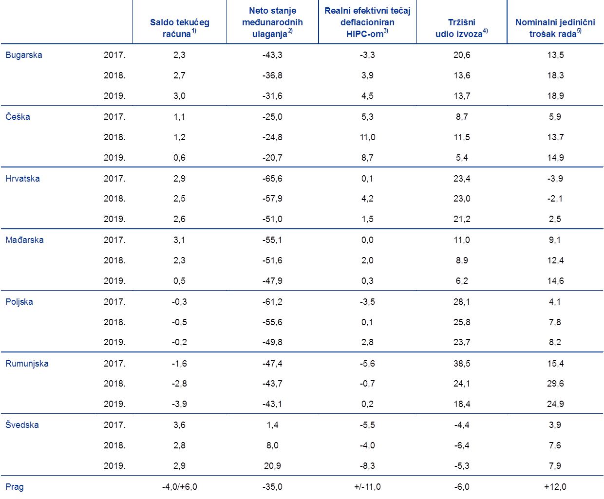 U tom smislu, ESB uzima u obzir zakonodavni paket o gospodarskom upravljanju u EU‑u koji je stupio na snagu 13. prosinca 2011. Nadovezujući se na odredbe Ugovora iz članka 121. stavka 6., Europski parlament i Vijeće EU‑a donijeli su detaljna pravila za postupak multilateralnog nadzora iz članka 121. stavaka 3. i 4. Ugovora. Ta pravila donesena su „kako bi se osigurala tješnja koordinacija ekonomskih politika i održive konvergencije gospodarskih rezultata država članica” (članak 121. stavak 3.) i jer je „potrebno izvući pouke iz prvog desetljeća funkcioniranja ekonomske i monetarne unije, a posebno u svrhu poboljšanog gospodarskog upravljanja koje se temelji na jačanju nacionalne odgovornosti”.[11] Zakonodavni paket uključuje poboljšani nadzorni okvir (postupak u slučaju makroekonomske neravnoteže, MIP) kojemu je cilj sprječavanje prekomjernih makroekonomskih i makrofinancijskih neravnoteža pomaganjem divergentnim državama članicama pri uspostavi korektivnih planova prije nego što se divergencije učvrste. MIP, koji se sastoji od preventivnoga i korektivnog dijela, primjenjuje se na sve države članice EU‑a, osim na one koje su već uključene u program međunarodne financijske pomoći te su zbog toga podložne temeljitoj kontroli i moraju ispunjavati određene uvjete. MIP uključuje mehanizam upozoravanja za rano otkrivanje neravnoteža, koji se temelji na transparentnom prikazu skupa pokazatelja s pragovima upozorenja za sve države članice EU‑a, i ekonomsku ocjenu. Ta ocjena, među ostalim, treba uzeti u obzir nominalnu i realnu konvergenciju u europodručju i izvan njega.[12] Pri postupku ocjenjivanja makroekonomskih neravnoteža treba osobito uzeti u obzir njihovu ozbiljnost i njihove moguće negativne učinke ekonomskoga i financijskog prelijevanja, što povećava osjetljivost gospodarstva EU‑a i ugrožava nesmetano funkcioniranje ekonomske i monetarne unije.[13]