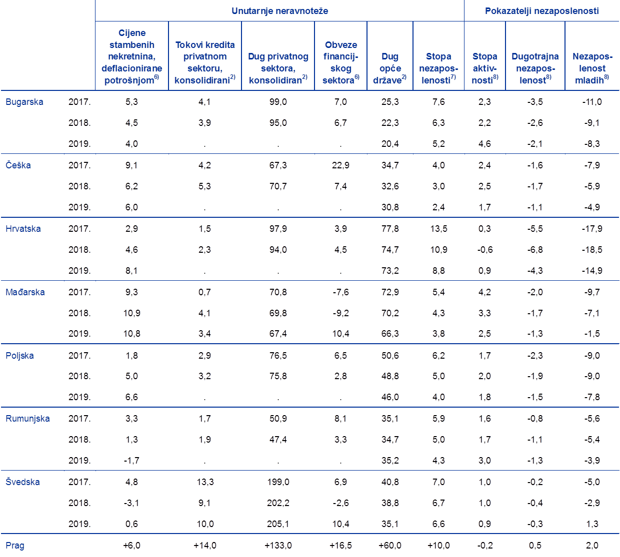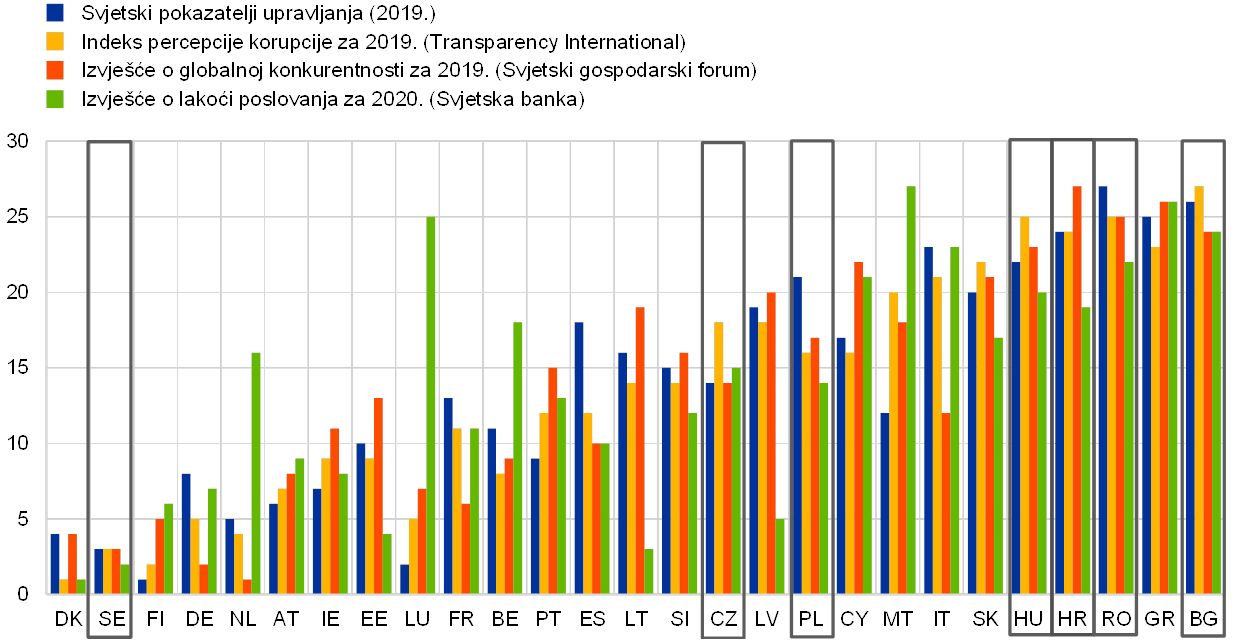 Osim toga, što se tiče država EU‑a, stavljanjem institucija u središte pozornosti samo se dobilo na analitičkoj i političkoj važnosti tijekom posljednjih godina. Stoga i nadalje, općenito govoreći, još uvijek ima dovoljno mjesta za poboljšanje mjerenja. Naposljetku, pristupi država složenom pitanju kao što su institucionalna kvaliteta ili dobro upravljanje nužno su donekle nedostatni i očito je da ih je potrebno dopuniti procjenama specifičnijim za pojedine države i dugoročnijim procjenama. Istodobno, poteškoće pri mjerenju ne bi trebale rezultirati narušavanjem tih važnih odrednica dugoročnog napretka, socijalne pravednosti i blagostanja. - U siječnju 2020. u srednjoročnom je cilju Hrvatske strukturni deficit promijenjen s 1,75 % BDP‑a na strukturni deficit od 1 % BDP‑a.