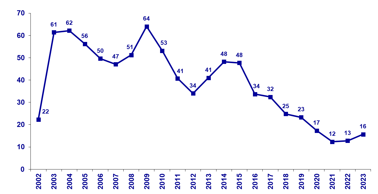 Vaikka löytyneiden väärennösten osuus aidoista seteleistä on hyvin pieni, niiden absoluuttinen määrä kasvoi vuodesta 2022, jolloin väärennöksiä oli koronaviruspandemian (COVID-19) jäljiltä poikkeuksellisen vähän. Väärennösten määrä oli kuitenkin pienempi kuin pandemiaa edeltäneinä vuosina.