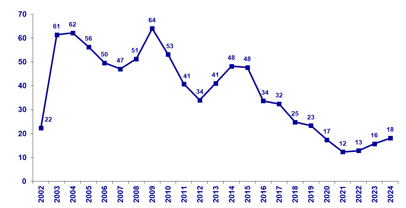 Quelque 554 000 faux billets en euros ont été retirés de la circulation en 2024. La probabilité de recevoir une contrefaçon est faible, le nombre de faux billets étant très minoritaire par rapport au nombre de billets en euros authentiques en circulation. En 2024, 18 billets contrefaits ont été détectés par million de coupures authentiques en circulation, ce qui est très peu par rapport aux niveaux observés après l’introduction de l’euro (cf. graphique).