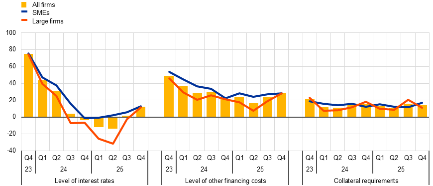 In the most recent round of the Survey on the Access to Finance of Enterprises (SAFE), covering the fourth quarter of 2025, euro area firms reported a net increase in interest rates on bank loans (net 12%, compared with 2% in the previous quarter). A similar increase was observed by both small and medium-sized enterprises (SMEs) and large firms. At the same time, a net 28% of firms (up from 23% in the previous quarter) observed increases in both other financing costs (i.e. charges, fees and commissions) and collateral requirements (net 14%, compared with 16% in the third quarter of 2025) (Chart 1).