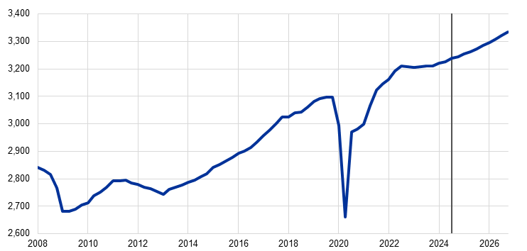Det forventes, at Euroområdets økonomi vil fortsætte den gradvise bedring i de kommende år på baggrund af betydelig geopolitisk og politisk usikkerhed. Selvom væksten igen steg moderat i løbet af 2024, tyder de seneste indikatorer på en svækkelse af væksten på kort sigt med fortsat afdæmpet forbrugertillid og stor usikkerhed, der sandsynligvis vil styrke husholdningernes opsparingsincitamenter. Ikke desto mindre er forudsætningerne for en fornyet styrkelse af den økonomiske vækst til stede. Især forventes en stigning i reallønnen og beskæftigelsen i en situation med robuste arbejdsmarkeder at understøtte et opsving, hvor forbruget fortsat er en af de vigtigste drivkræfter. Den indenlandske efterspørgsel bør også blive styrket af en lempelse af finansieringsforholdene i overensstemmelse med markedets forventninger til den fremtidige renteudvikling. Selvom finanspolitikken er omgivet af stor usikkerhed, antages den generelt at være på en konsolideringskurs. Ikke desto mindre bør midler fra Next Generation EU-programmet (NGEU) støtte væksten indtil programmets udløb i 2027. Under den grundlæggende antagelse, at Europas vigtigste handelspartneres handelspolitik forbliver uændret, forventes den udenlandske efterspørgsel at styrke og understøtte euroområdets eksport. Som følge heraf forventes det, at nettohandlen vil yde et stort set neutralt bidrag til BNP-væksten trods de eksisterende udfordringer med hensyn til konkurrenceevnen. Arbejdsløsheden forventes at falde yderligere til et historisk lavt niveau. Da nogle af de cykliske faktorer, der på det seneste har reduceret produktiviteten, begynder at aftage, forventes produktiviteten at stige i fremskrivningsperioden, selvom der stadig er strukturelle udfordringer. Samlet set ventes den gennemsnitlige årlige vækst i realt BNP at blive på 0,7 pct. i 2024, 1,1 pct. i 2025 og 1,4 pct. i 2026, inden den falder til 1,3 pct. i 2027. Sammenlignet med ECB's stabs makroøkonomiske fremskrivninger fra september 2024 er udsigterne for BNP-væksten blevet nedjusteret, hovedsagelig som følge af revisioner af data om investeringer i 1. halvår af 2024, forventninger om en svagere eksportvækst i 2025 og en lille nedjustering af den ventede vækst i den indenlandske efterspørgsel i 2026.[1]