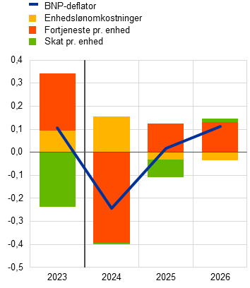 21. Væksten i fortjeneste pr. enhed forventes at stige fra 2,0 pct. i 2026 til 2,4 pct. i 2027. Dette hænger delvis sammen med den forventede registrering af ETS2-ordningen i nationalregnskabet som en produktionsafgift, når emissionstilladelserne returneres, dvs. året efter auktioneringen. ETS2-indtægterne for 2027 vil således først blive registreret i nationalregnskabet i 2028, mens de endelige priser allerede forventes at stige i 2027 (jf. tekstboks 2). Bruttooverskuddet af produktionen ventes derfor at blive midlertidigt løftet i 2027.