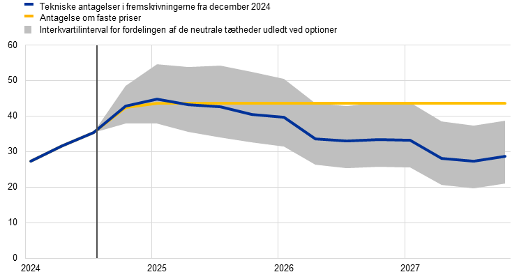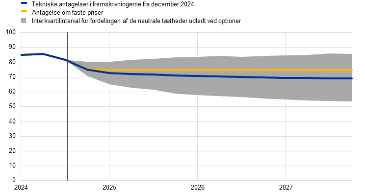 Sammenlignet med fremskrivningerne fra september 2024 er de vigtigste ændringer af de tekniske antagelser lavere olie- og elpriser, men højere gaspriser, en svagere valutakurs og lavere renter. Antagelser om olie- og elpriser, der er baseret på futurespriser, er blevet nedjusteret noget, mens antagelserne vedrørende gas er blevet opjusteret for 2025 og nedjusteret en smule for 2026. Energipriserne antages at falde i fremskrivningsperioden. Råvarepriserne ekskl. energi er blevet væsentligt opjusteret for 2025 og nedjusteret en smule for 2026. Eurokursen er deprecieret med 3,0 pct. over for den amerikanske dollar og med 1,3 pct. målt i nominelle effektive termer og antages at forblive konstant i fremskrivningsperioden. På baggrund af markedsforventningerne er antagelserne om den korte rente blevet nedjusteret med 20-30 basispoint i 2025-26, mens antagelserne om de lange obligationsrenter er blevet opjusteret en smule.