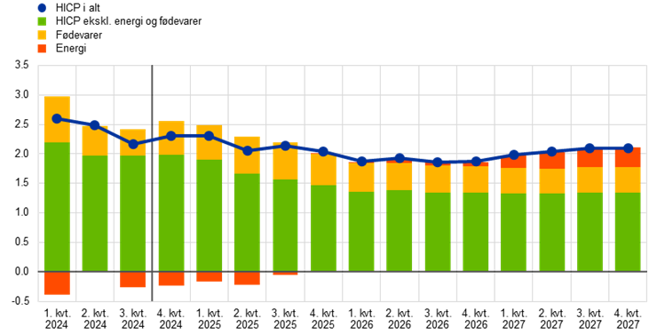 Den samlede HICP-inflation ventes at stige i slutningen af 2024, inden den fra 2. kvartal af 2025 falder til omkring ECB's inflationsmål på 2 pct. Basiseffekterne i energikomponenten forventes at blive den primære drivkraft bag den midlertidige stigning i inflationen ved begyndelsen af fremskrivningsperioden. På grundlag af antagelser om faldende olie- og gaspriser vil energiinflationen sandsynligvis forblive negativ indtil andet halvår af 2025 for derefter at forblive afdæmpet med undtagelse af en stigning i 2027 som følge af indførelsen af nye foranstaltninger til modvirkning af klimaændringer. Fødevareinflationen forventes at stige indtil midten af 2025, hovedsagelig som følge af en stigning i priserne på uforarbejdede fødevarer, inden den falder til et gennemsnit på 2,2 % i 2027. HICP-inflationen ekskl. energi og fødevarer (HICPX) forventes at falde i begyndelsen af 2025, efterhånden som den indirekte effekt af tidligere energiprischok og lønomkostningspresset aftager, og de forsinkede virkninger af tidligere pengepolitiske stramninger fortsat slår igennem på forbrugerpriserne. Dette fald forventes at blive drevet af et fald i inflationen for tjenesteydelser, som hidtil har været forholdsvis vedvarende. Samlet set forventes HICPX-inflationen at aftage fra 2,9 pct. i 2024 til 1,9 pct. i 2027. Lønvæksten vil i første omgang fortsat være høj, men vil falde gradvis i takt med, at inflationspresset aftager. Den aftagende vækst i lønomkostningerne pr. ansat forventes kombineret med et opsving i produktivitetsvæksten at føre til en betydeligt langsommere vækst i enhedslønomkostningerne. Som følge heraf ventes det indenlandske prispres at aftage, idet avancerne i første omgang afbøder det stadig høje pres på arbejdskraftsomkostningerne, men retter sig i løbet af fremskrivningsperioden. Samlet set bør det eksterne prispres forblive moderat. Sammenlignet med fremskrivningerne fra september 2024 er udsigterne for den samlede HICP-inflation blevet nedjusteret marginalt i 2024 og 2025, hovedsagelig på grund af nedadrettede dataoverraskelser og lavere forventninger til olie- og elpriserne.