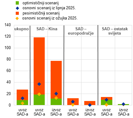 Prema pesimističnijem scenariju SAD i Kina suočili bi se s izraženim makroekonomskim posljedicama. Predviđa se da će više carine potaknuti rast potrošačkih cijena te da će inflacija u SAD‑u u 2025. i 2026. porasti za oko 0,5 postotnih bodova (Grafikon D, dio a)). Izvoz SAD‑a u druge zemlje ne bi se povećao, ali bi se neznatno povećao uvoz SAD‑a iz drugih zemalja. Veća neizvjesnost povezana s trgovinskim politikama dodatno bi nepovoljno utjecala na rast. Rast realnog BDP‑a SAD‑a bio bi za oko 0,7 postotnih bodova slabiji nego u osnovnom scenariju za 2026. Prema pesimističnijem scenariju i Kina bi se suočila s negativnim posljedicama. Visoke američke carine na uvoz iz Kine i kineske protumjere dovele bi do snažnog smanjenja bilateralne trgovine, ali povećao bi se kineski izvoz u druge zemlje, uključujući europodručje. Rast kineskog realnog BDP‑a bio bi za 0,6 postotnih bodova slabiji u 2025. i za 0,3 postotna boda slabiji u 2026., što bi smanjilo inflaciju u 2026. (Grafikon D, dio b)).