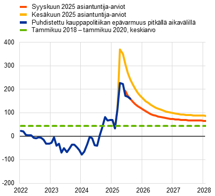 Huom. Kohdassa a luvut viittaavat kauppapolitiikan epävarmuuden puhdistettuun mittariin (ks. alaviite 5). Tuoreimmat tiedot ovat heinäkuulta 2025. Kohdan b estimaateissa ei oteta huomioon tuontitullien vaikutusta teknisiin oletuksiin (kuten valuuttakurssiin).