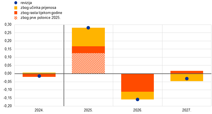 Napomene: Početak projekcijskog razdoblja označen je okomitom crtom. Revizije se temelje na nezaokruženim vrijednostima. Dio stupca s crvenim prugama pokazuje utjecaj ostvarenja u prvom i drugom tromjesečju 2025. na rast tijekom godine za 2025.
