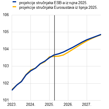 Inflacijski izgledi u skladu su sa stabiliziranjem inflacije na razinama oko srednjoročnog cilja od 2 %. Predviđa se da će ukupna inflacija mjerena harmoniziranim indeksom potrošačkih cijena (HIPC) uglavnom ostati nepromijenjena i iznositi oko 2 % u preostalom dijelu 2025. te da će se potom smanjiti na 1,7 % u 2026. i porasti na 1,9 % u 2027. Smanjenje u 2026. upućuje na daljnje postupno smanjenje komponenata inflacije bez energije. Inflacija cijena energije trebala bi pak i nadalje biti kolebljiva, ali porasti tijekom projekcijskog razdoblja, djelomično zbog uvođenja sustava EU‑a za trgovanje emisijama (ETS2) u 2027. Očekuje se da će inflacija cijena hrane u početku ostati povišena zbog prijenosa odgođenih učinaka prošlih povećanja međunarodnih cijena prehrambenih sirovina, ali da će se u 2026. i 2027. smanjiti na razine malo više od 2 %. Inflacija mjerena HIPC‑om bez energije i hrane trebala bi se smanjiti kako budu popuštali pritisci plaća i smanjivala se inflacija cijena usluga te kako se aprecijacija eura bude prenosila kroz cjenovni lanac i ograničavala inflaciju cijena dobara. Očekuje se da će manji rast plaća, kao posljedica nadoknađivanja prošlog pada realnih plaća, zajedno s oporavkom rasta produktivnosti znatno usporiti rast jediničnih troškova rada. U odnosu na projekcije iz lipnja 2025. izgledi za ukupnu inflaciju mjerenu HIPC‑om revidirani su naviše za 0,1 postotni bod za 2025. i 2026. zbog viših stvarnih i pretpostavljenih cijena energenata te zbog odgođenih učinaka viših međunarodnih cijena prehrambenih sirovina, koji više nego neutraliziraju aprecijaciju eura. Kada je riječ o 2027., predviđa se da će prevladavati odgođeni učinci aprecijacije eura, zbog čega je došlo do revizije naniže za 0,1 postotni bod.