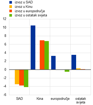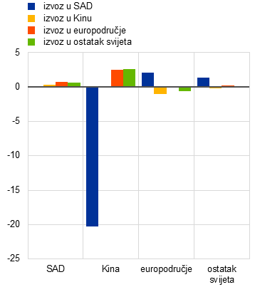 Napomene: Grafikon prikazuje promjene u bilateralnoj trgovini u četvrtom tromjesečju 2027. (neponderirano). Kina ima djelomično upravljani tečaj. Ostatak svijeta izračunava se kao jednostavan prosjek odstupanja izvoza od osnovnog scenarija za sve regije u modelu ECB‑Global osim SAD‑a, Kine i europodručja.