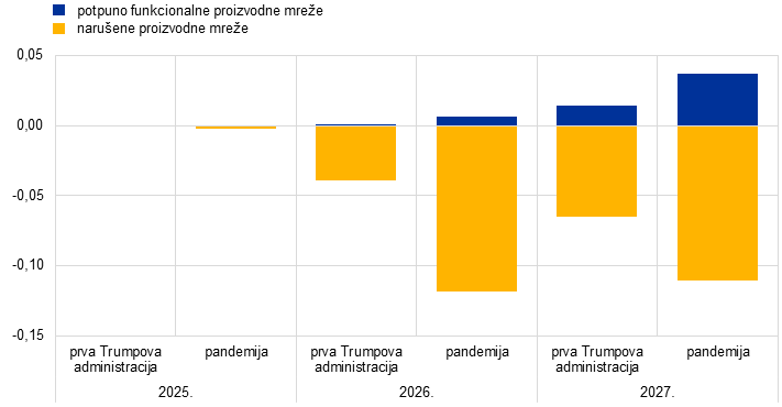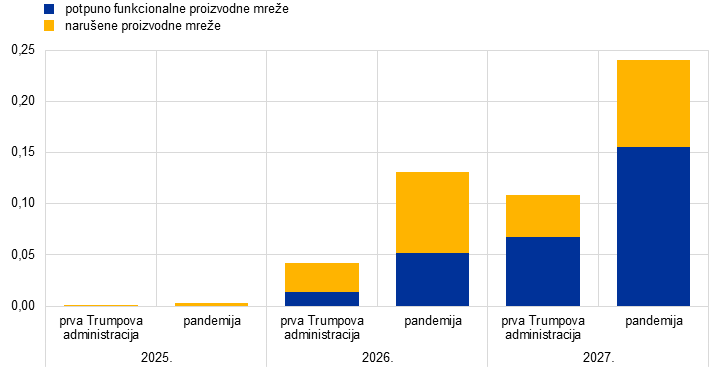 Dok su makroekonomski učinci na europodručje prema prvom alternativnom kretanju minimalni, prema drugom su znatni i obilježeni jačim poremećajima u opskrbnim lancima, kao što je bio slučaj tijekom pandemije. Usredotočimo li se prvo na rezultate za gospodarstvo s potpuno funkcionalnim proizvodnim mrežama dobivene modelom ECB‑BASE, u slučaju kretanja s uskim grlima u opskrbnim lancima sličnima onima koja su zabilježena tijekom prve Trumpove administracije nastali bi samo minimalni inflacijski pritisci, pri čemu bi inflacija mjerena HIPC‑om bila za manje od 0,1 postotnog boda viša u 2027. (Grafikon 20., dio b), plavi dijelovi stupaca). Prema scenariju sa šokovima sličnima onima iz razdoblja pandemije inflacijski učinci bili bi izraženiji a inflacija mjerena HIPC‑om za 0,15 postotnih bodova viša u 2027. (Grafikon 20., dio b), plavi dijelovi stupaca). Obje analize osjetljivosti pokazuju da je utjecaj na realni BDP zanemariv ili blago pozitivan, što je u skladu s pretpostavkom da se kamatne stope neće mijenjati, a to s obzirom na višu inflaciju upućuje na smanjenje realnih kamatnih stopa koje bi potaknulo aktivnost (Grafikon 20., dio a), plavi dijelovi stupaca). Analiza se proširuje primjenom višedržavnog, višesektorskog modela kojim se uzimaju u obzir input-output veze između sektora, uključujući narušene proizvodne mreže u drugim regijama i blokade opskrbnih lanaca. Tom se pretpostavkom smanjuje zamjenjivost unutar proizvodnih lanaca, što bi dovelo do izraženijih učinaka (Grafikon 20., žuti dijelovi stupaca). U tom bi slučaju u odnosu na osnovni scenarij inflacija u 2027. mogla biti do 0,1 postotnog boda viša u scenariju prve Trumpove administracije i gotovo 0,25 postotnih bodova viša u ekstremnijem pandemijskom scenariju, dok bi se rast BDP‑a blago smanjio.[19]