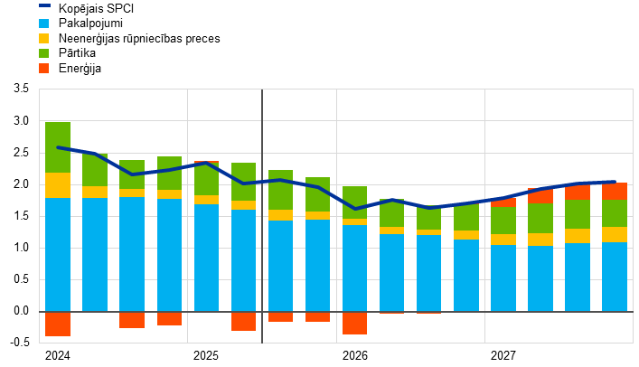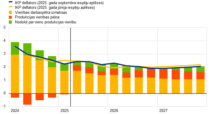 Inflācijas perspektīva ir saskaņā ar inflācijas stabilizēšanos aptuveni 2 % vidējā termiņa mērķa līmenī. Paredzams, ka kopējā inflācija, ko mēra ar saskaņoto patēriņa cenu indeksu (SPCI), atlikušajos 2025. gada mēnešos virzīsies horizontāli aptuveni 2 % līmenī un pēc tam 2026. gadā saruks līdz 1.7 %, bet pēc tam 2027. gadā atkal pieaugs līdz 1.9 %. Kritums 2026. gadā atspoguļo turpmāku pakāpenisku neenerģijas komponentu sarukumu, savukārt enerģijas cenu inflācija arī turpmāk būs svārstīga, bet iespēju aplēšu periodā pieaugs, daļēji tāpēc, ka 2027. gadā sāks darboties otrā ES emisijas kvotu tirdzniecības sistēma (ETS2). Gaidāms, ka pārtikas cenu inflācija sākotnēji saglabāsies paaugstināta sakarā ar starptautisko pārtikas izejvielu cenu agrākā kāpuma novēloto ietekmi, bet 2026. un 2027. gadā kāpuma temps kļūs lēnāks (nedaudz virs 2 %). Gaidāms, ka SPCI inflācija (neietverot enerģijas un pārtikas cenas; SPCIX) pazemināsies, mazinoties darba samaksas spiedienam un pakalpojumu cenu inflācijai kļūstot mērenākai un euro kursa kāpumam atspoguļojoties dažādos cenu noteikšanas posmos un ierobežojot preču cenu inflāciju. Gaidāms, ka darba samaksas pieauguma kritums pēc tam, kad būs atgūti agrākie reālās darba samaksas zaudējumi, kopā ar darba ražīguma pieauguma atjaunošanos noteiks būtiski lēnāku vienības darbaspēka izmaksu pieaugumu. Salīdzinājumā ar 2025. gada jūnija iespēju aplēsēm kopējās SPCI inflācijas perspektīva gan 2025., gan 2026. gadam koriģēta un paaugstināta par 0.1 procentu punktu sakarā ar augstākiem enerģijas izejvielu cenu rezultātiem un pieņēmumiem, kā arī augstāku starptautisko pārtikas izejvielu cenu novēloto ietekmi, kas ar uzviju kompensē euro kursa kāpumu. Tiek uzskatīts, ka 2027. gadā euro kursa kāpuma novēlotā ietekme dominēs, tāpēc attiecīgi veikta lejupvērsta korekcija par 0.1 procentu punktu.