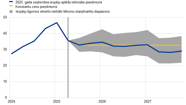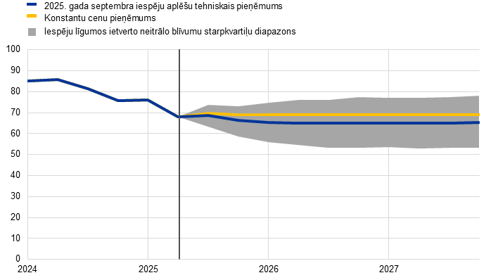 Piezīmes. Līmeņu korekcijas izsaka procentos un pieauguma tempa un gada procentuālo rādītāju korekcijas – procentu punktos. Izaugsmes tempa un procentu likmju korekcijas aprēķina, izmantojot skaitļus, kas noapaļoti līdz vienam ciparam aiz komata, savukārt korekcijas, kas uzrādītas kā procentuālās pārmaiņas, aprēķina, izmantojot nenoapaļotus skaitļus. Tehniskie pieņēmumi par eurozonas procentu likmēm un izejvielu cenām balstīti uz tirgus gaidām atbilstoši stāvoklim 2025. gada 15. augustā. Naftas cenas ir Brent jēlnaftas tagadnes darījumu cenas un biržā tirgoto nākotnes līgumu cenas. Gāzes cenas ir Nīderlandes biržas gāzes tagadnes darījumu cenas un biržā tirgoto nākotnes līgumu cenas. Elektroenerģijas cenas ir piecu lielāko eurozonas valstu vidējās vairumtirdzniecības tagadnes darījumu cenas un biržā tirgoto nākotnes līgumu cenas. ETS1 kvotu (EUA) "sintētiskā" biržā tirgoto nākotnes līgumu cena atvasināta kā divu tuvāko Eiropas Enerģijas biržas EUA nākotnes līgumu lineāri interpolētā vērtība mēneša beigās. Pēc tam tiek noteiktas EUA biržā tirgoto nākotnes līgumu mēneša vidējās cenas, lai iegūtu gada rādītāja ekvivalentu. Tā kā ETS2 kvotas faktiski netiek tirgotas, Eurosistēmas speciālistu pieņēmumus par šīm cenām veido robežcena, virs kuras tiks atbrīvotas papildu kvotas, un šī cena aktualizēta atbilstoši 2027. gada cenām (sīkāku informāciju sk. Eurosistēmas speciālistu 2024. gada decembra iespēju aplēšu ielikumā "Novērtējums par klimata pārmaiņu pārkārtošanās politikas ietekmi uz izaugsmi un inflāciju"). Uz izejvielu cenu tendencēm norāda biržā tirgoto nākotnes darījumu tirgi 10 darbadienu laikā pirms pēdējā datu aktualizēšanas termiņa. Pieņemts, ka divpusējie valūtu kursi iespēju aplēšu periodā nemainīsies salīdzinājumā ar vidējiem rādītājiem, kuri dominēja 10 darbadienu periodā, kas beidzās pēdējā datu aktualizēšanas dienā. Pieņēmumi par eurozonas valstu valdības 10 gadu obligāciju nominālajām ienesīguma likmēm balstās uz valstu 10 gadu obligāciju vidējām ienesīguma likmēm, kas svērtas ar IKP gada rādītājiem. Ja pieejami nepieciešamie dati, konkrētu valstu valdības 10 gadu obligāciju nominālās ienesīguma likmes definē kā 10 gadu etalonobligāciju ienesīguma likmes, ko pielāgo, izmantojot biržā netirgoto nākotnes līgumu nominālās ienesīguma likmes, kas pēdējā datu aktualizēšanas termiņā iegūtas no atbilstošajām attiecīgo valstu ienesīguma līknēm. Pārējām valstīm attiecīgās valsts 10 gadu obligāciju ienesīguma likmes definē kā 10 gadu etalonobligāciju ienesīguma likmi, ko attiecina uz garāku periodu, izmantojot nemainīgu starpību (kas novērota pēdējā datu aktualizēšanas termiņā) ar tehnisko pieņēmumu par eurozonas bezriska ilgtermiņa procentu likmi.